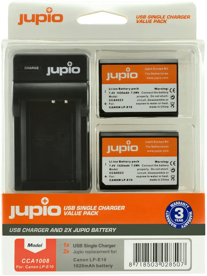 De Jupio Kit: Battery LP-E10 (2x) + Charger kit is geschikt voor verschillende Canon camera’s. De kit bestaat uit 2 LP-E10 accu’s en een acculader. Deze zijn onder andere geschikt voor de Canon EOS 1100D, 1200D, 1300D, 2000D, 4000D, LC-E10E acculader, BG-1H battery grip.