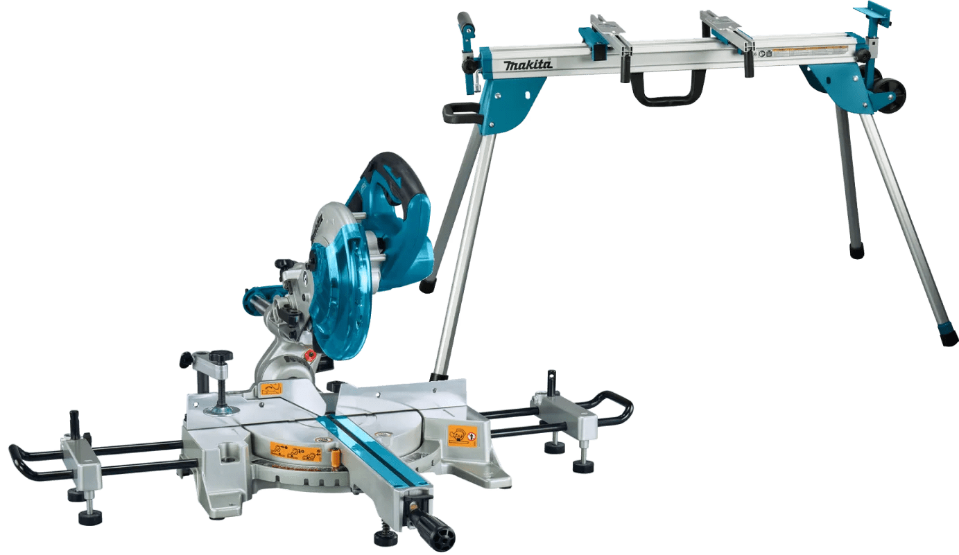In deze set zit naast een Makita DLS714NZ (zonder accu) afkortzaag ook een DEBWST06 onderstel. Je werkt zo altijd op een prettige werkhoogte van 85 centimeter. Zaag planken tot 300 millimeter breed en 52 millimeter diep. Ook als je schuin zaagt (in verstek), zaag je tot 52 millimeter hoog. Kantel de zaagkop naar links of rechts en maak gemakkelijk alle versteksneden. Je werkstuk draaien is niet nodig. Doordat het onderstel uitschuifbaar is, zaag je werkstukken van maximaal 255 centimeter lang. Ook leg je er zonder problemen maximaal 225 kilogram op. Is de ondergrond ongelijk? Dan pas je de hoogte van de stelvoeten aan, waardoor de DLS714NZ (zonder accu) + Onderstel alsnog stevig staat.