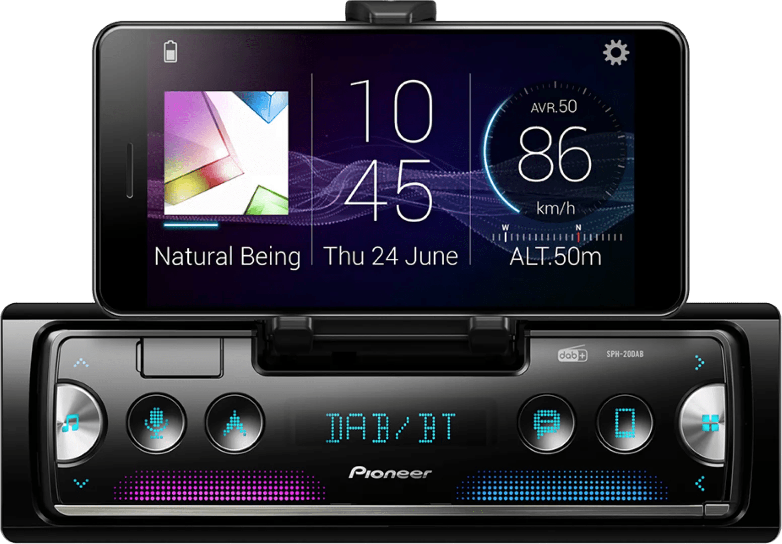 De Pioneer SPH-20DAB is een 1-DIN autoradio met ingebouwde telefoonhouder. Sluit je smartphone aan op de autoradio en zet hem in de houder. Het display van de radio is nu groter en uitgebreider. Via DAB+ luister je naar digitale radio. Doordat het signaal digitaal is, hoor je geen ruis en ontvang je meer nationale zenders. Koppel via bluetooth draadloos een smartphone of tablet aan de autoradio en stream je eigen muziek in de auto. De telefoonhouder is te gebruiken met telefoons van 58 tot 170 millimeter hoog, 58 tot 87 millimeter breed en 4 tot 10 millimeter diep.