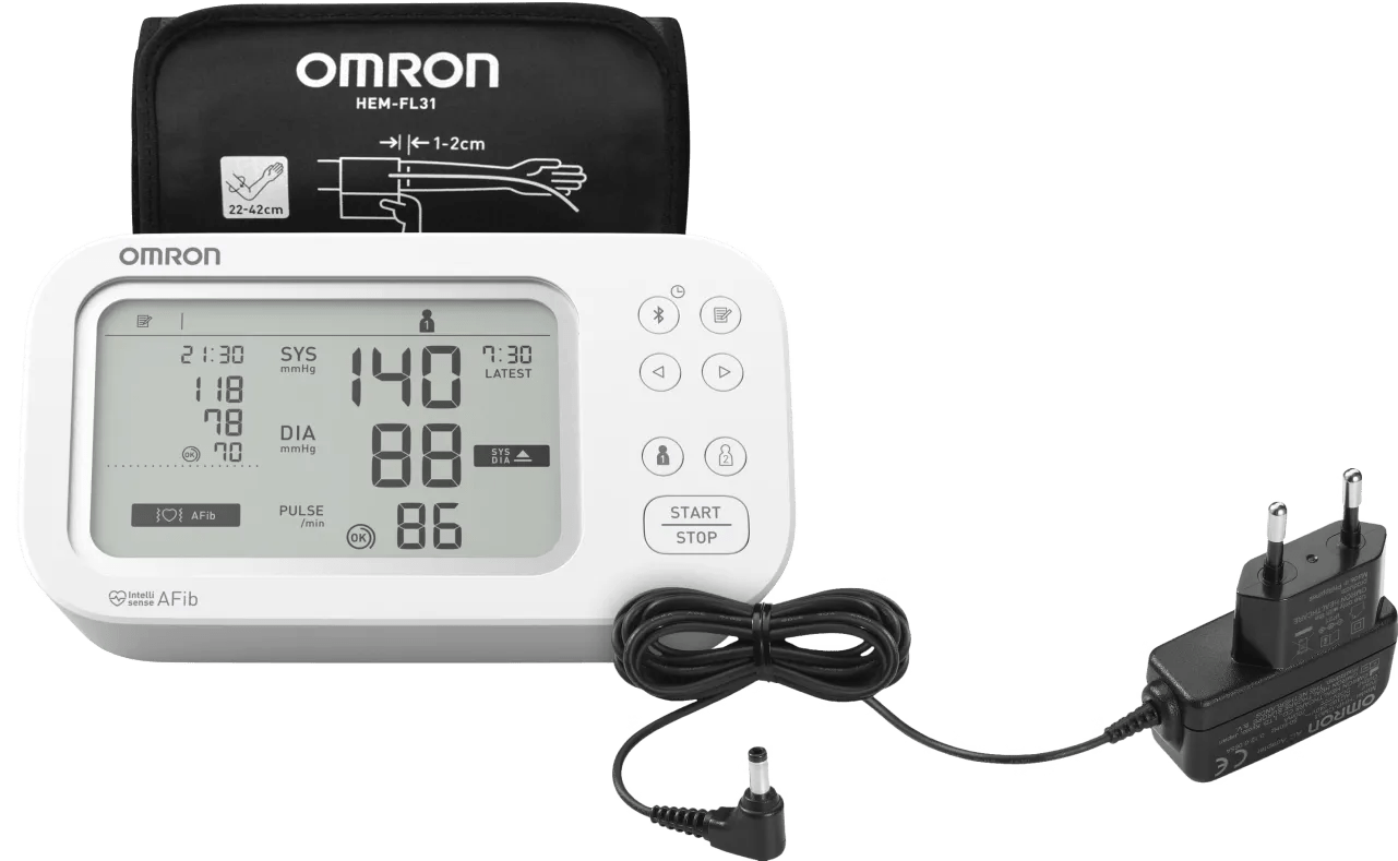 Met de Omron X7 Smart AFib + AC Adapter meet je altijd je bloeddruk, ook als de batterijen leeg zijn. Dankzij de meegeleverde adapter gebruik je hem namelijk ook zonder batterijen. Je controleert bij elke bloeddrukmeting ook gelijk op boezemfibrilleren. Zo houd je niet alleen je bloeddruk in de gaten, maar ontdek je ook mogelijke hartritmestoornissen. Je verbindt de bloeddrukmeter met de Omron Connect app. Hierin houd je alle metingen overzichtelijk bij en krijg je meer inzicht in je gezondheid. Je meet gemakkelijk je bloeddruk. De Intelli Wrap band doe je namelijk in elke positie om je bovenarm. Je krijgt een melding als je hem verkeerd omdoet. Zo voorkom je een onnauwkeurige meting. Je gebruikt het apparaat met 2 personen. Per persoon sla je 100 metingen op.