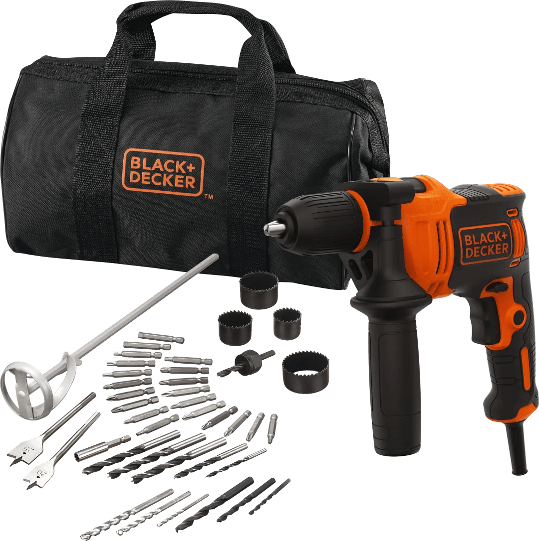 Een schilderij of een fotolijst ophangen doe je met de BLACK+DECKER BEH710SA40-QS. Deze klopboormachine gebruik je om te boren in hout, metaal of (dankzij de klopfunctie) in steen. Zo kun je niet alleen de wanden binnen opleuken, maar ook de bakstenen muur buitenshuis. Bij deze boormachine wordt standaard een tas meegeleverd met een 40-delige accessoireset. Zo heb je voor verschillende soorten klussen de juiste boor meteen bij de hand. De boormachine werkt op netstroom waardoor je tijdens het boren voorzien bent van een continue stroomvoorziening en geen rekening hoeft te houden met op te laden accu’s.