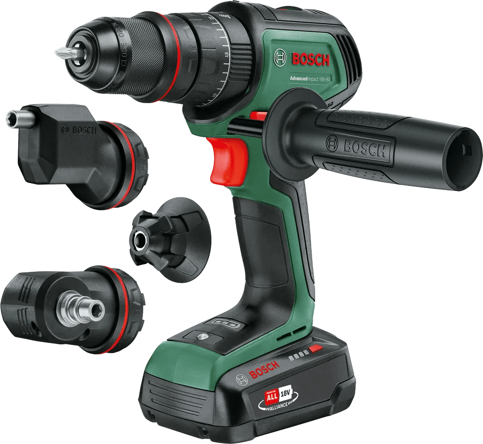 De Bosch AdvancedImpact 18V-80 QuickSnap is de krachtigste klopboormachine van de Bosch Groen lijn. De boormachine heeft een boorcapaciteit van maximaal 13 millimeter in steen en een maximaal koppel van 82 newtonmeter. Hierdoor voer je zonder problemen zware schroef- en boorklussen uit, ook in harde steensoorten. Werk je op een plek met weinig licht? Dat is geen probleem. Door het ingebouwde licht zie je wat je doet. De boormachine is onderdeel van het Bosch Power For All accu platform. Heb je al een accu van dit accu platform in huis? Dan gebruik je die ook op de AdvancedImpact 18V-80 QuickSnap klopboormachine.