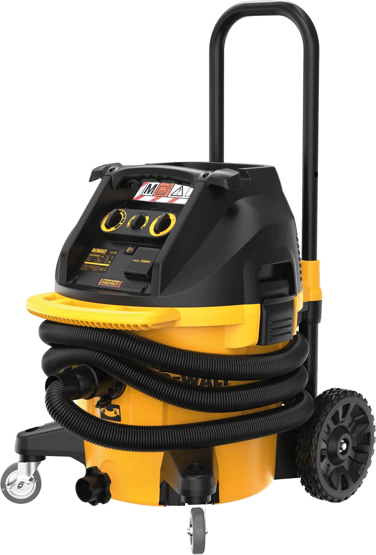 Zuig water, bouw- en kwartsstof op met de DeWalt DWV905M-QS. De bouwstofzuiger heeft stofklasse M, waardoor je veilig werkt. Door de inhoud van 38 liter werk je lang zonder dat je de zak of ketel tussendoor leegt. Je gereedschap sluit je aan op het apparaat, zodat je stof direct opzuigt tijdens je klus. Pas de zuigkracht aan en maak verschillende ondergronden schoon. Ligt er vuil in een moeilijk bereikbare hoek? Met de blaasfunctie blaas je dit gemakkelijk aan de kant. Je werkt ver van het stopcontact door het snoer van 4,5 meter. Het handvat is uitschuifbaar, waardoor je de bouwstofzuiger gemakkelijk verplaatst.