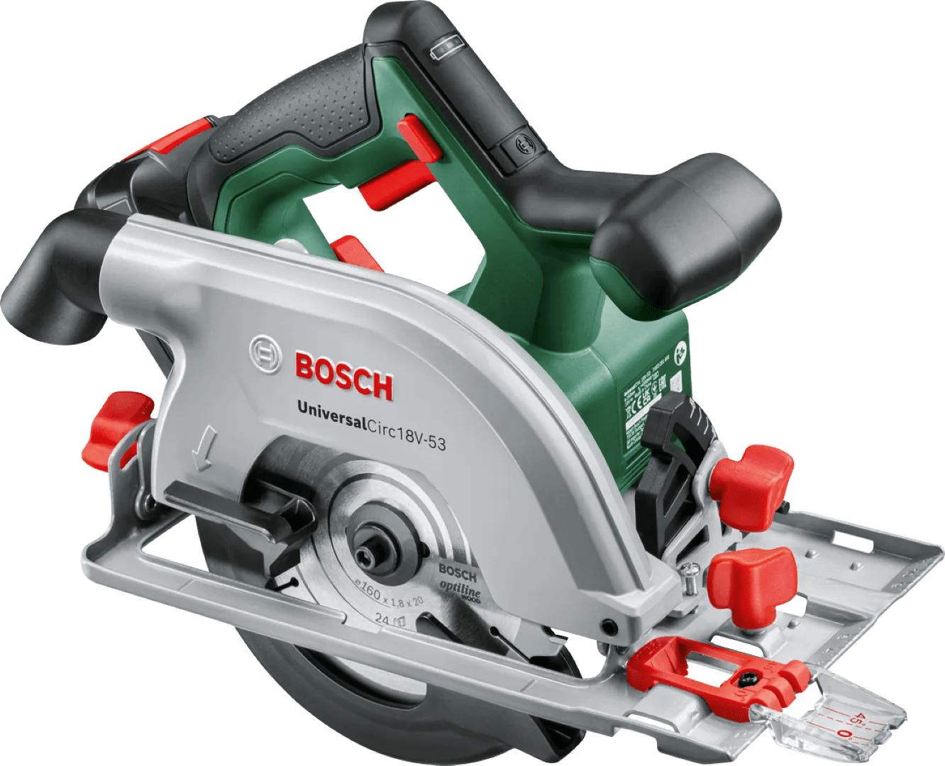 Met de Bosch UniversalCirc 18V-53 (zonder accu) zaag je balken en plaatmateriaal op maat waar je ook bent. Deze cirkelzaag werkt namelijk op een Bosch POWER FOR ALL 18 volt accu (niet meegeleverd). Hierdoor ben je niet afhankelijk van een stopcontact. Dankzij het onbelaste toerental van 4300 toeren per minuut zaag je tot 53 millimeter diep. Voor schuine zaagsnedes stel je de machine in op een hoek van 45 graden. Je zaagt dan tot maximaal 36 millimeter diep. Rechte zaagsnedes zijn gegarandeerd dankzij de schaduwlijn en parallelgeleider. Je krijgt een 160 millimeter zaagblad meegeleverd. Dus als je al de juiste Bosch Power For All 18V accu in huis hebt, ga je meteen aan de slag.