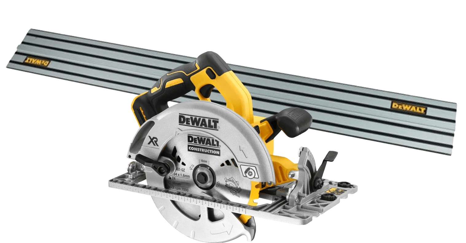 Zaag gemakkelijk rechte lijnen met de DeWalt DCS572NT-XJ + DeWalt DWS5022-XJ. De invalcirkelzaag zet je zonder moeite vast op de geleiderail. De geleiderail is 150 centimeter lang, waardoor je gemakkelijk lange plinten of kozijnen zaagt. Ook begin je probleemloos midden in een werkstuk. Dat is handig, want zo maak je gaten voor bijvoorbeeld kabels of een gootsteen. De invalcirkelzaag zaagt recht tot 58 millimeter diep. Kantel de zaag naar links of rechts en zaag schuin (in verstek). Je zaagt dan planken van maximaal 42 millimeter dik. De zaag hoort bij het DeWalt XR 18V accu platform. Heb je al een accu van dit platform in huis? Dan gebruik je die ook op dit apparaat.