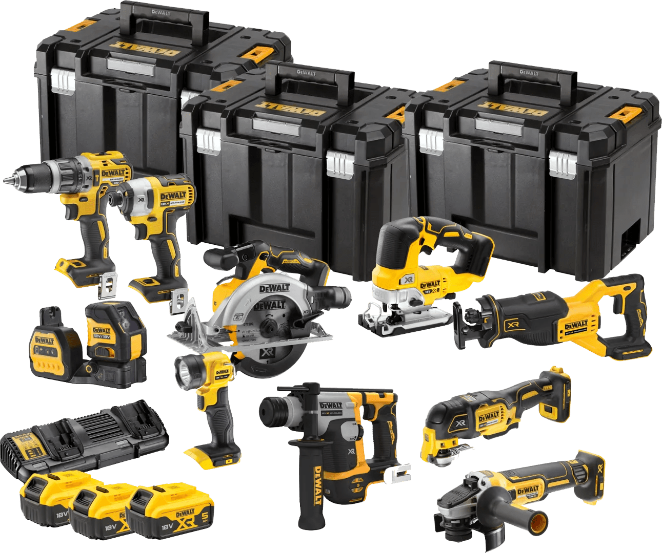 In deze DeWalt DCK1012P4T-QW Combiset zitten maar liefst 10 verschillende machines. In de 3 meegeleverde TSTAK IV koffers berg je alle machines netjes op. Boor- en schroefklussen voer je uit met de combihamer (DCH172), klopboormachine (DCD796) of slagschroevendraaier (DCF887). Voor zaag, slijp en schuurklussen gebruik je de cirkelzaag (DCS565), decoupeerzaag (DCS382), reciprozaag (DCS382), haakse slijper (DCG405) of multitool (DCS356). Met de kruislijnlaser (DCE088NG18) lijn je verschillende werkzaamheden perfect uit. Zo zorg je dat de stopcontacten in huis op dezelfde hoogte zitten. ’s Avonds zie je goed wat je doet dankzij de werklamp (DCL040). Je gebruikt de 4 meegeleverde 18 volt 5,0 Ah accu’s op het gereedschap uit deze set, maar ook op ander DeWalt XR 18V gereedschap.