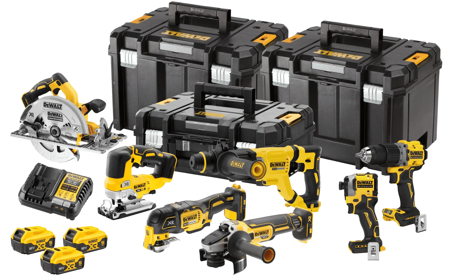 Met de DeWalt DCK706P3T-QW Combiset haal je 7 krachtige machines in huis. Zo begin je direct met zware boor-, zaag- en slijpklussen. In de set zit een klopboormachine, combihamer, slagschroevendraaier, cirkelzaag, decoupeerzaag, haakse slijper en een multitool. Breid de cirkelzaag uit met een geleiderail (niet meegeleverd) en zaag zonder moeite recht. Door de kleine schroefkop van de slagschroevendraaier werk je probleemloos in krappe hoeken. De combihamer heeft een slagkracht van 3 joule, zodat je gemakkelijk in beton boort. Na gebruik berg je het gereedschap op in de 3 stapelbare TSTAK koffers. De 3 meegeleverde accu’s van 5,0 Ah horen bij het DeWalt XR 18V accu platform. Je gebruikt de accu’s daardoor ook op ander DeWalt 18V XR (tuin)gereedschap.