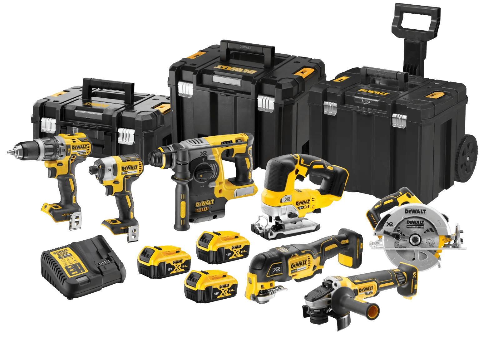 Haal de DeWalt DCK755P3T-QW Combiset in huis en je hebt in 1 klap 7 stuks DeWalt gereedschap bij de hand voor de meest uiteenlopende werkzaamheden. De verschillende boor,- zaag- en slijpmachines zijn allemaal voorzien van een koolborstelloze motor, wat ze geschikt maakt voor intensief en veelvuldig gebruik. Gebruik de meegeleverde koffers om alles netjes in op te bergen. Stapel de TSTAK koffers op de trolley en je verrijdt moeiteloos al je gereedschap terug naar de bus of naar een andere werkruimte. De set bestaat uit een klopboormachine (DCD796), slagschroevendraaier (DCF887), multitool (DCS355), haakse slijper (DCG405), cirkelzaag (DCS570), decoupeerzaag (DCS334) en combihamer (DCH273). Een complete set dus, waarmee je veelomvattende klussen van A tot Z uitvoert. De 3 18 volt accu’s gebruik je op alle meegeleverde powertools, maar ook op ander DeWalt accugereedschap.