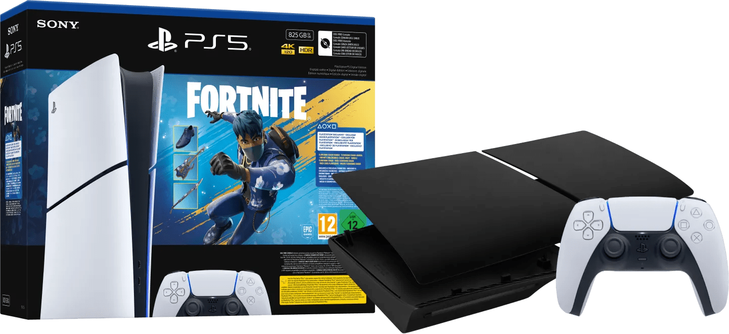 PlayStation 5 Slim Digital Edition Fortnite bundel + Covers Zwart + Extra Controller Wit