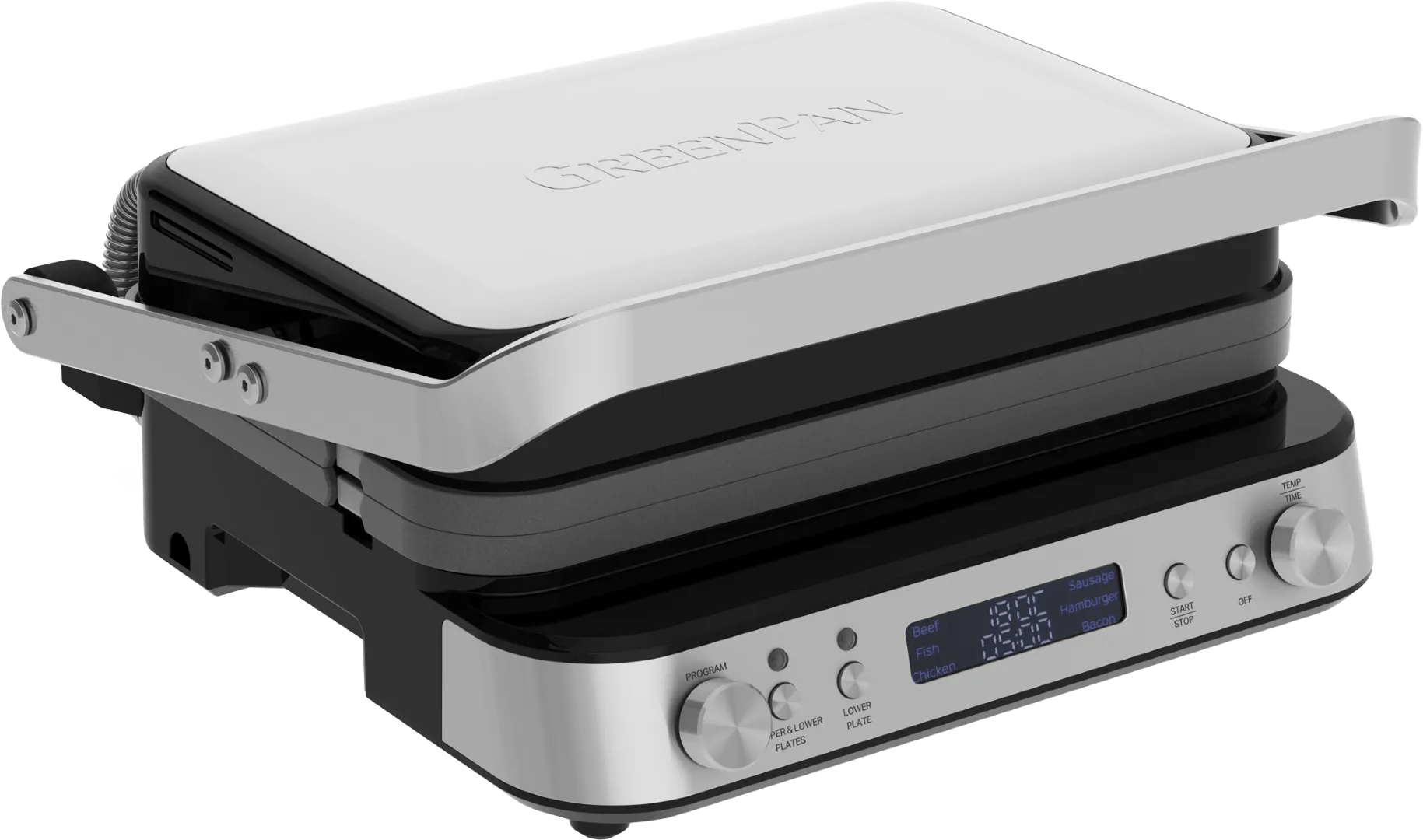 Met de GreenPan Bistro Contactgrill grill je op een milieubewuste manier ingrediënten. De contactgrill heeft namelijk PFAS vrije bakplaten. Hierdoor zijn de platen vrij van chemische stoffen en gaan ze langer mee dan standaard antiaanbaklaag. Je bedient de contactgrill handmatig of via de voorgeprogrammeerde bakprogramma’s, zoals hamburgers, vis of bacon. Handig, want zo denk je niet meer na over de juiste baktemperatuur en -tijd. Wil je verschillende ingrediënten tegelijkertijd bereiden? Dan stel je de temperatuur van de bakplaten apart van elkaar in. Zo bak je groenten op een lagere temperatuur dan stukken vlees. Na gebruik zet je de afneembare bakplaten in de vaatwasser.