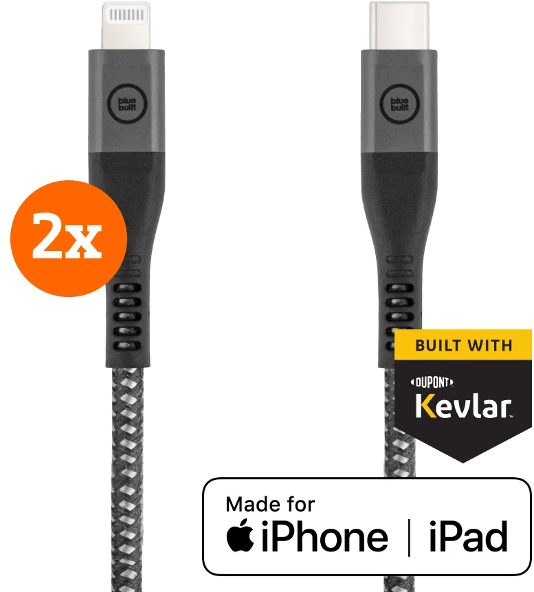 Laad je iPhone 14 of ouder, iPad met Lightning poort en AirPods op met de kabels uit dit BlueBuilt Usb C naar Lightning Kabel 1,5m Kevlar Zwart Duo Pack. Heb je een iPhone 15? Dan heb je een usb C kabel nodig. In deze bundel krijg je 2 kabels. Houd de extra kabel achter de hand als reserve, of leg 'm in je auto of op werk. Deze usb C naar Lightning kabels passen op nieuwe Power Delivery snelladers, maar niet op oude opladers met een usb A poort. De kevlar kabels zijn verstevigd met metaal en gaan langer mee dan standaard kabels. Je gebruikt de kabel voor opladen en data overzetten, niet voor het overzetten van beeld. Je krijgt 5 jaar garantie op deze BlueBuilt oplaadkabels. Wil je meer bewegingsvrijheid tijdens het opladen? Kies dan voor een 3 meter lange kabel.