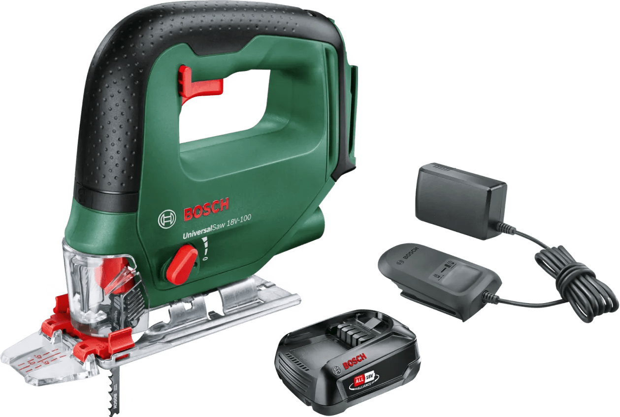 Zaag direct bochten en kromme lijnen met de Bosch UniversalSaw 18V-100 + POWER FOR ALL 18V 2,5 Ah Accu Set. De decoupeerzaag komt tot 100 millimeter diep in hout en tot 8 millimeter diep in metaal. Ook krijg je een CutControl en antisplinterstrip, waardoor je gemakkelijk recht zaagt met een splintervrij resultaat. Je krijgt niet snel last van je armen, omdat de machine maar 1,6 kilogram weegt. Ook zie je de zaaglijn door de handige blaasfunctie altijd goed. De meegeleverde 2,5 Ah accu hoort bij het Bosch Power For All 18V accu platform. Je gebruikt hem daardoor ook op ander (tuin)gereedschap van dit platform.
