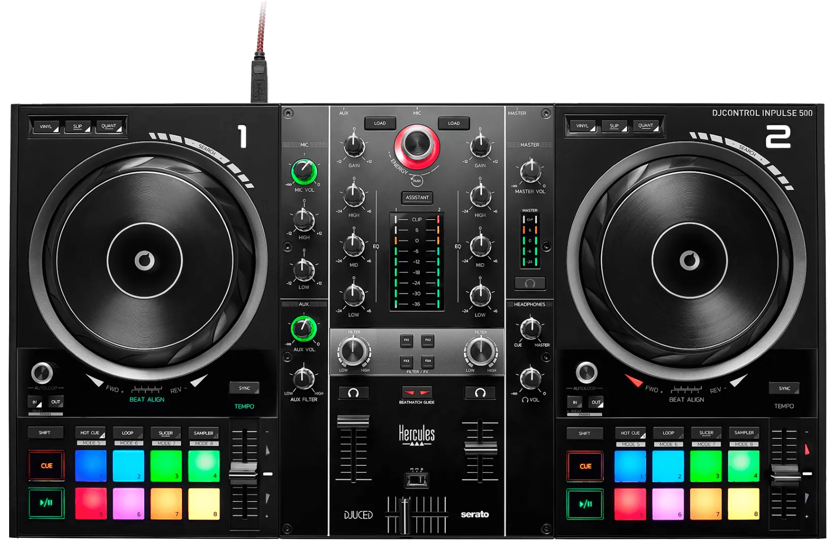 De Hercules DJControl Inpulse 500 is een DJ controller voor kinderen en beginners. Dit exemplaar beschikt over een intelligent music assistent die je ondersteunt bij het draaien. De assistent begeleidt je met instructies via lichtsignalen. Hierdoor mix je 2 nummers met elkaar ook al heb je geen ervaring met draaien. Je krijgt ondersteuning bij het beatmatchen. Dit is het proces waarbij je de snelheid van 2 nummers gelijk aan elkaar zet. Je ziet het aan de led lampjes wanneer je de 2 nummers wel of niet in hetzelfde tempo speelt. Bij de DJ controller wordt DJ software meegeleverd. Je kiest of je de volledige versie van DJUCED of de demoversie van Serato DJ gebruikt.