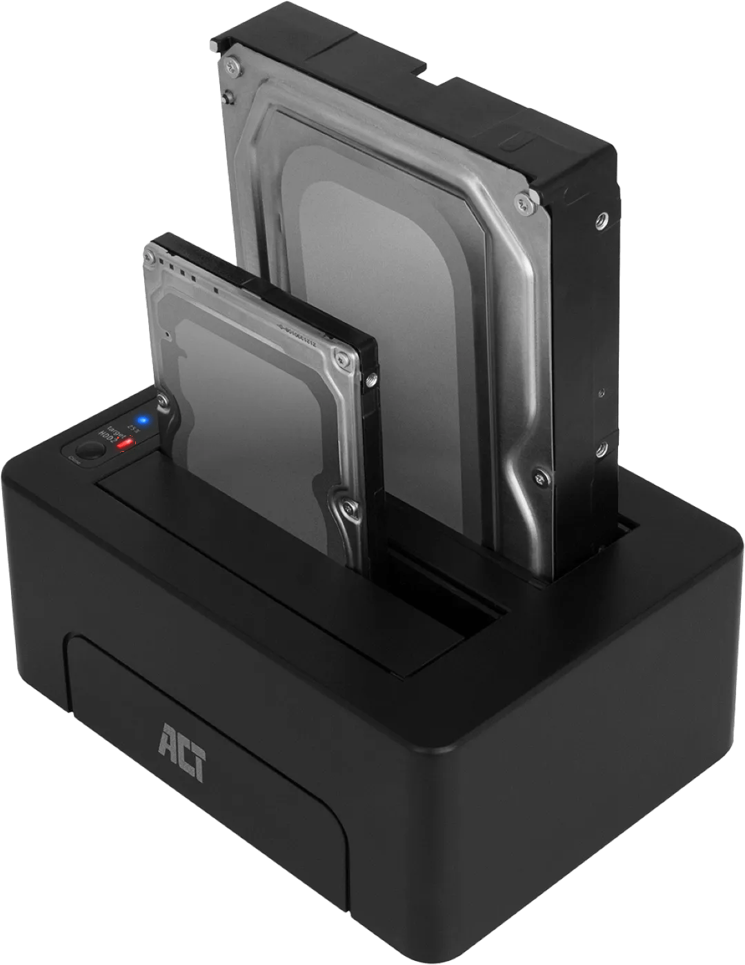 Koppel een 2,5 inch en 3,5 inch SATA HDD of SSD aan het ACT AC1504 Dual docking station en zet eenvoudig je data over via usb. Dit dock biedt de ruimte voor 2 schijven tegelijkertijd, zodat je altijd een eenvoudige toegang hebt ongeacht het formaat van je schijf. De AC1504 is uitgerust met een indicatielampje, zodat je altijd weet wanneer je data klaar is met transferreren. Ben je geen held met inbouwen? Geen probleem, dit docking station is plug & play. Verbind het station met je computer en klik vervolgens de SATA schijf in het dock om aan de slag te gaan. Door de usb 3.1 aansluiting zet je data in enkele seconden over. Heb je geen usb 3.1 aansluiting? Geen zorgen, het dock werkt ook met usb 3.0 en usb 2.0.