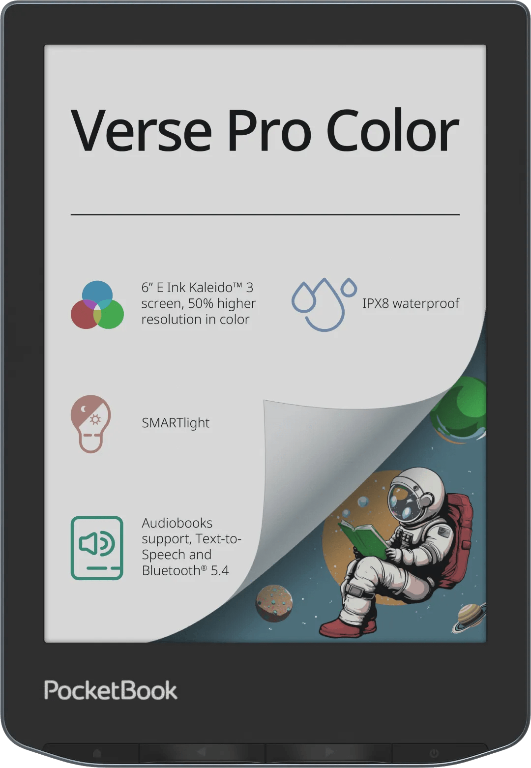 Lees onderweg je favoriete boeken in kleur met de PocketBook Verse Pro Color Grijs. Door het kleurenscherm komen stripboeken, afbeeldingen en boekomslagen meer tot leven. Je neemt de compacte en lichte 6 inch e-reader gemakkelijk mee. Dat is handig als je bijvoorbeeld met de trein reist. Via SMARTlight stel je de helderheid en kleurtemperatuur van het scherm naar wens in. Zo lees je ook buiten en 's avonds. Je bedient de e-reader met het touchscreen of de 4 knoppen. Luister je veel audioboeken, muziek of podcasts? Verbind je draadloze oordopjes of koptelefoon via bluetooth met je e-reader. Deze e-reader heeft ook een ingebouwde voorleesfunctie om je e-books aan je voor te lezen. Met deze waterbestendige e-reader lees je jouw favoriete boeken veilig in bad of aan het zwembad. Je krijgt geen oplader meegeleverd. Bestel 'm erbij en laad je e-reader direct op.