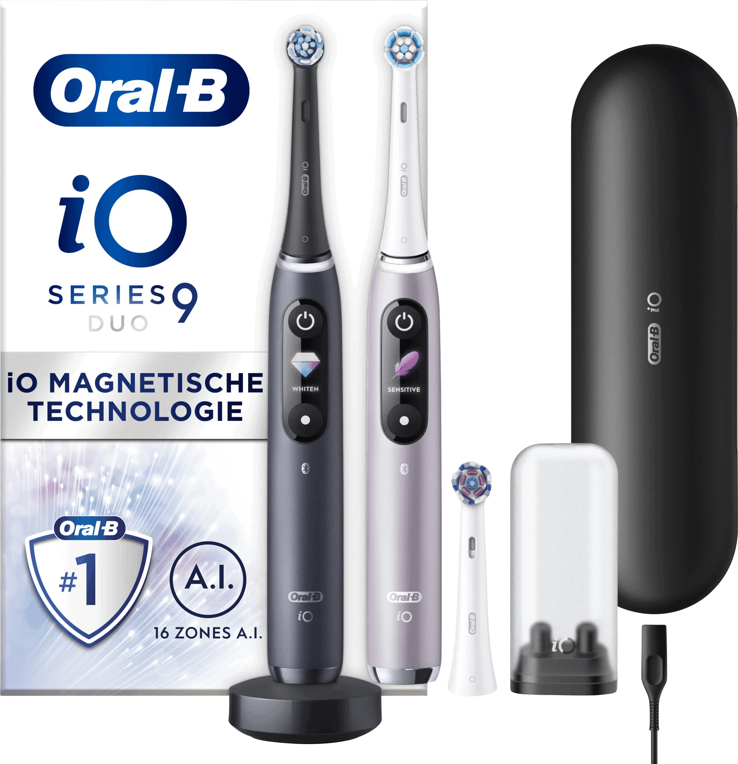Met de Oral-B iO9n Rozenkwarts en Onyx Zwart Duo Pack Speciale Editie poets jij je tanden iedere dag schoon en wit. Dat doe je niet alleen, maar gezellig samen. Je ontvangt namelijk 2 tandenborstels in deze duoverpakking. De tandenborstels hebben een technologie die jouw gebit schoon en gezond achterlaat na elke poetsbeurt. Met 7 verschillende poetsstanden verwissel je van intensiteit met één druk op de knop. Je koppelt de Oral-B app aan je tandenborstel voor feedback over je poetsbeurt. Zo verbeter je je poetstechniek tot in de puntjes. De tandenborstel heeft een timer, poetsdruksensor en een accuduur van 14 dagen. Ook ontvang je een luxe etui waar je de accessoires en tandenborstel netjes in opbergt. Let op: de Oral-B iO tandenborstels werken alleen met de Oral-B iO opzetborstels. Let op: de mogelijke talen op het display zijn alleen Engels en Nederlands.