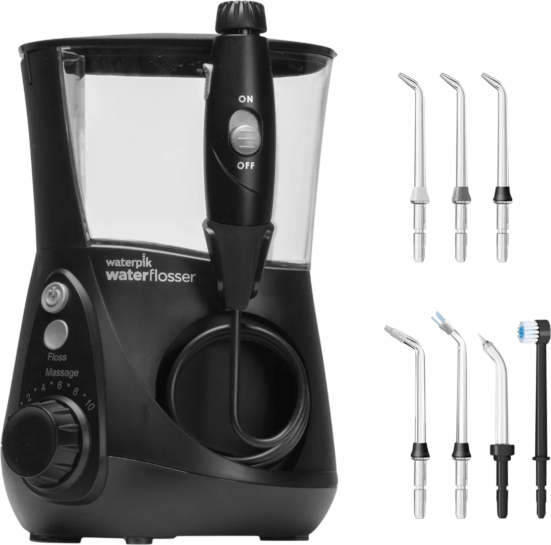 Met de massagestand van de Waterpik WP-662 help jij je ontstoken tandvlees te genezen. In deze stand stuwt het flosapparaat namelijk op een milde manier waterbursts tegen je tandvlees. Je stimuleert zo de doorbloeding en helpt je tandvlees weer de oude te worden. Het flosapparaat beschikt over 10 verschillende intensiteiten én een timer. Deze timer geeft je een seintje als je van zone moet wisselen. Verder ontvang je een set van 7 opzetstukken. Je kiest dus elke dag voor een spuitkop die op dat moment het beste op jouw behoeften aansluit. Na gebruik plaats je de spuitkoppen op de houder en berg je alles weer hygiënisch op.