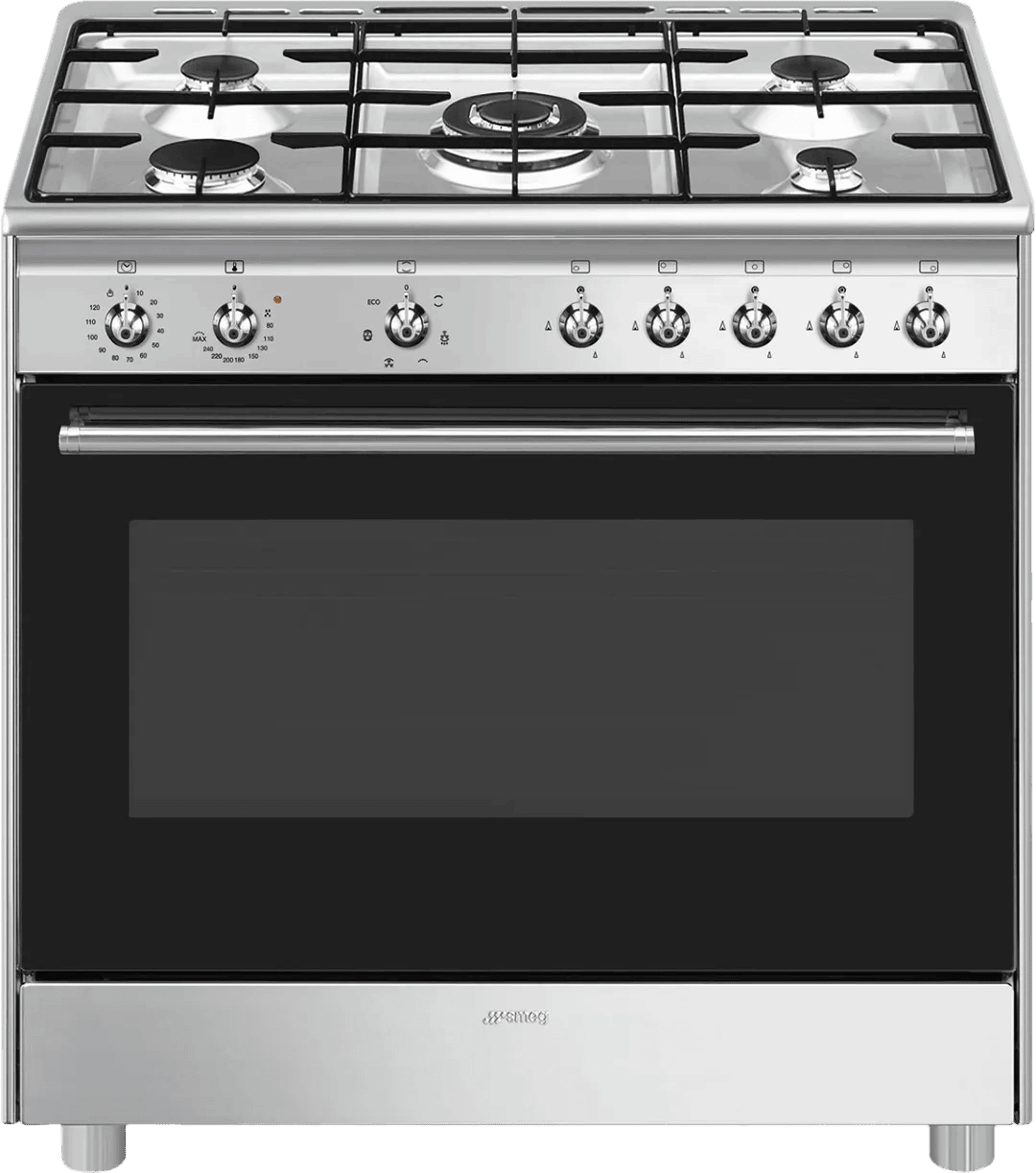 Het SMEG CX91GMXNLK gasfornuis is 90 centimeter breed en heeft 5 kookzones. Zo heb je voldoende ruimte voor al je pannen. Op de wokbrander verwarm jij snel een grote pan. Handig, wanneer je veel eters over de vloer krijgt. Het fornuis heeft naast de wokbrander een sterkbrander en 3 normaalbranders. Zo bak jij een uitgebreide maaltijd. Je maakt meerdere schalen lasagne of burrito's klaar in de brede oven van 129 liter. Op de 5 inschuifhoogtes bepaal je zelf de juiste hoogte voor jouw bakplaten. Zo bak je vis, aardappels en gegrilde groenten gemakkelijk in één keer. Met een draai aan de knop ontsteekt de vlam via elektronische vonkontsteking. Gaat de vlam uit, dan sluit de vlambeveiliging de gastoevoer af.