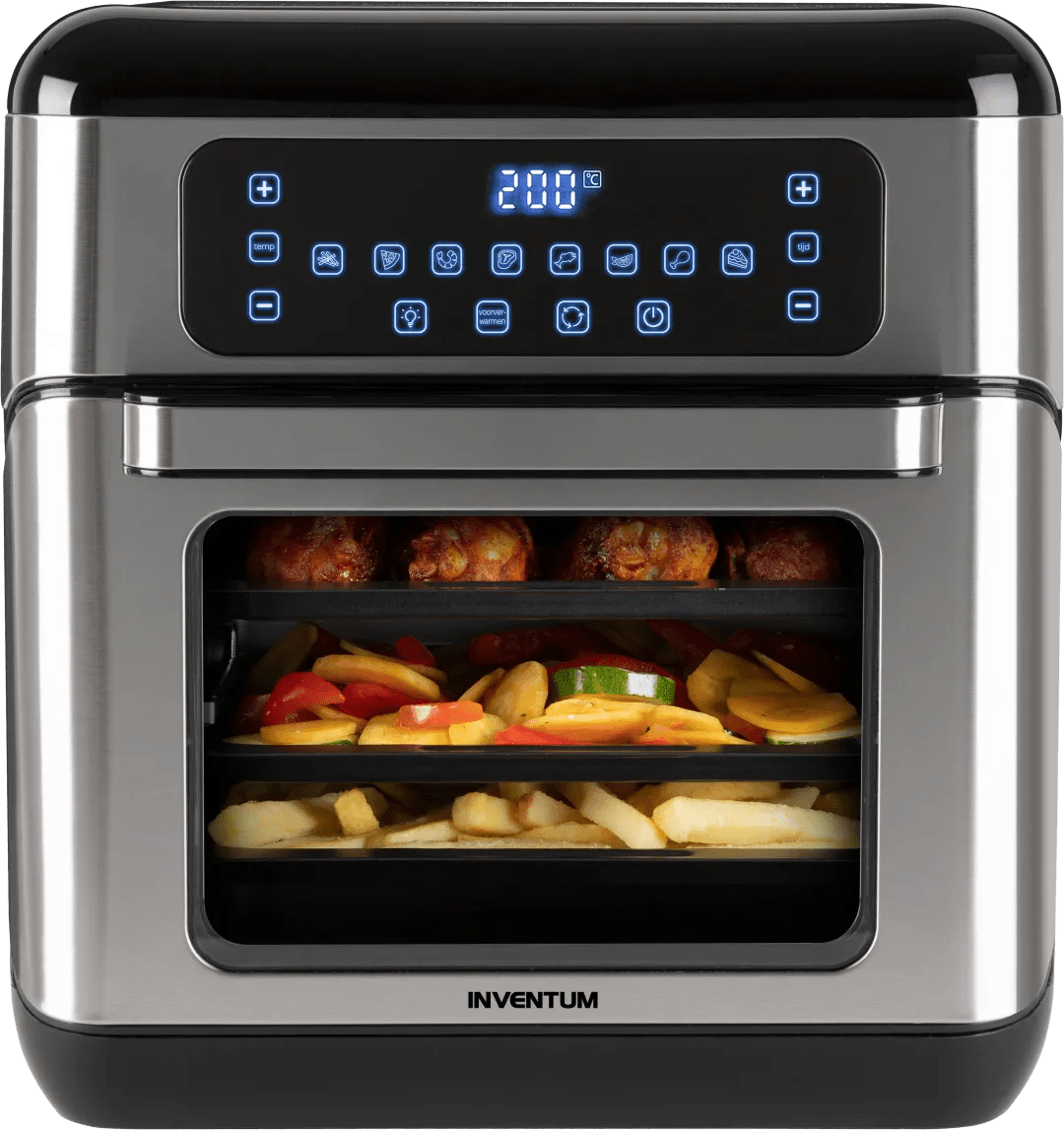 Met de Inventum Hetelucht Friteuse Oven GF1200HLD bak je 3 verschillende ingrediënten tegelijk dankzij de 3 lagen. Zo bereid je in één keer een complete maaltijd met vlees, groenten en frietjes. Er zit ook een roterende mand en een draaispit bij. Hiermee bak je bijvoorbeeld frietjes of een kip rondom knapperig. De airfryer heeft meerdere automatische programma's. Zo heb je met één druk op de knop de juiste instellingen voor bijvoorbeeld kip, vis, pizza of gebak. Dankzij de minimum temperatuur van 40 graden Celsius ontdooi je er ook ingrediënten in. Ben je klaar? Dan reinig je alle losse onderdelen gewoon in de vaatwasser.