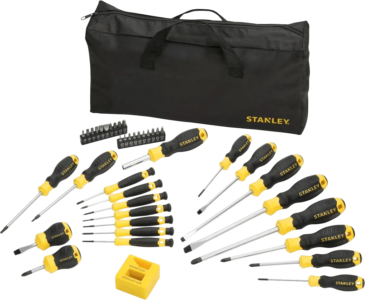 De ene schroef is de andere niet. Dat weet iedereen. Dus is het zinvol om meer dan 1 schroevendraaier in huis te hebben. De Stanley 42-delige Schroevendraaierset is een zeer complete set waarmee je uiteenlopende schroefklussen uitvoert. Zo heb je de beschikking over verschillende schroevendraaiers in allerlei maten, maar ook accessoires zoals schroefbits en een magnetiseur. Al dit moois wordt in een handige tas geleverd, zodat je alles netjes bij elkaar opbergt.