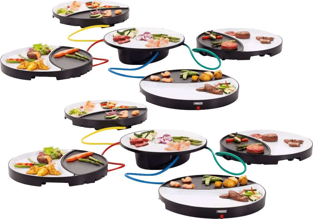 Met de Princess Dinner4All - 8 personen gourmet jij samen met een grote groep op individuele bakplaten. Handig, want zo bereid iedereen op zijn eigen manier gerechtjes en worden smaken van bijvoorbeeld vlees en vis niet gemengd. De set bestaat uit 8 aparte bakplaten met een anti-aanbaklaag, die je aansluit op 2 centrale units. Leg alvast stukjes kip, vis, aardappeltjes en wat groenten op de meegeleverde serveerschalen en plaats de schalen op de centrale units in het midden van de tafel. Zo pakt en bereidt iedereen zijn eigen gerechtjes. Naast een eigen bakplaat beschikt iedereen ook over een eigen aardewerken bord. Als iedereen uitgegeten is, reinig je de bakplaten met de hand en gaan de aardewerken borden in de vaatwasmachine.