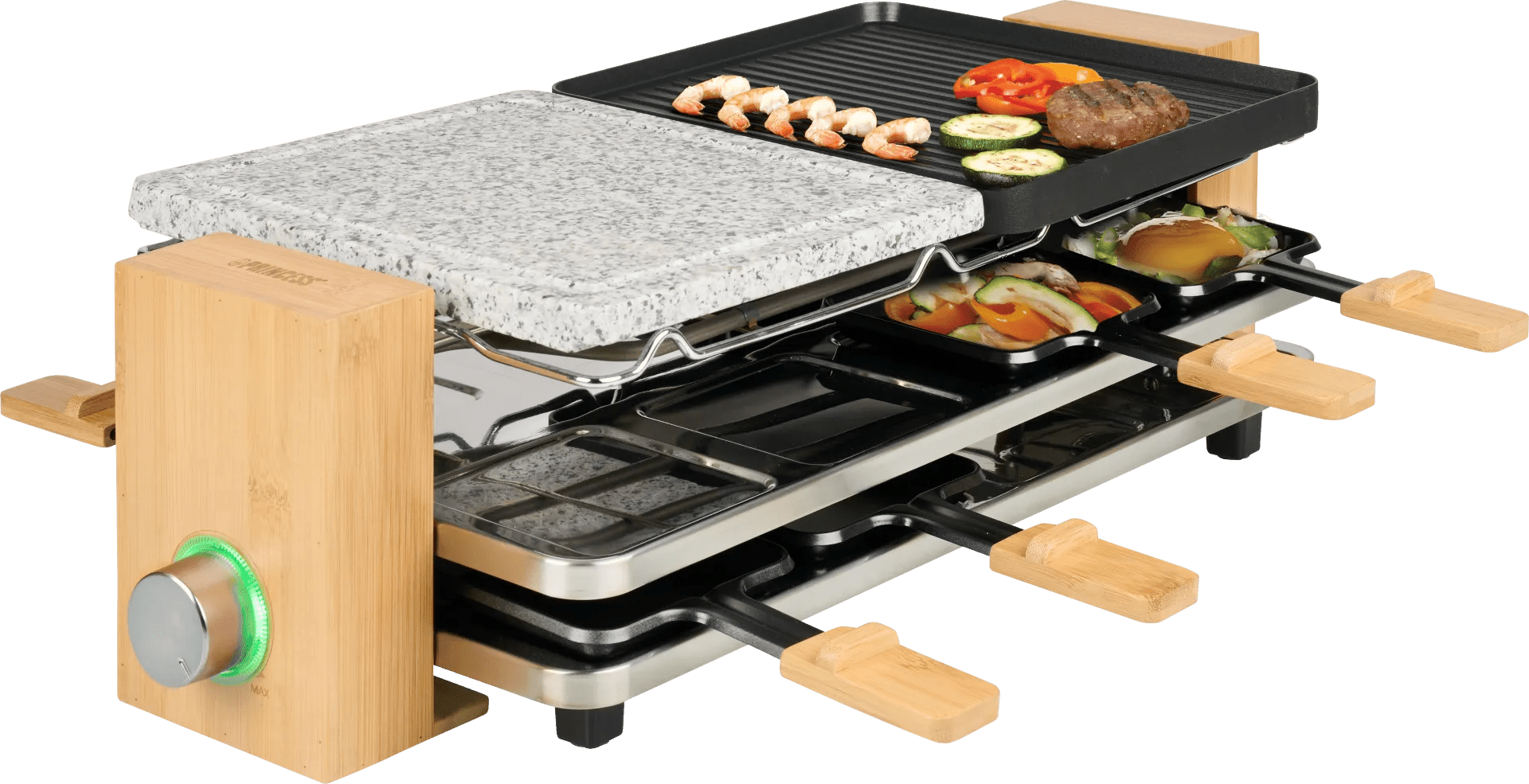 Je gebruikt de Princess Raclette Pure 8 162955 voor (steen)grillen, bakken en raclette. Het gourmetstel is groot genoeg voor 8 personen. Dankzij de stenen grillplaat gebruik je geen boter of olie. Hierdoor gril je een stuk gezonder. Je stelt de temperatuur in via de regelbare thermostaat. Deze draai je wat harder als je een biefstukje wil dichtschroeien of draai je wat zachter als iedereen bijna uitgegeten is. Onder de grillplaten raclette je gemakkelijk een eitje of uiringen voor bijvoorbeeld je hamburger. Alle platen hebben een antiaanbaklaag. Fijn, zo blijven er geen ingrediënten vastkleven. Na gebruik reinig je de losse onderdelen in de vaatwasser.