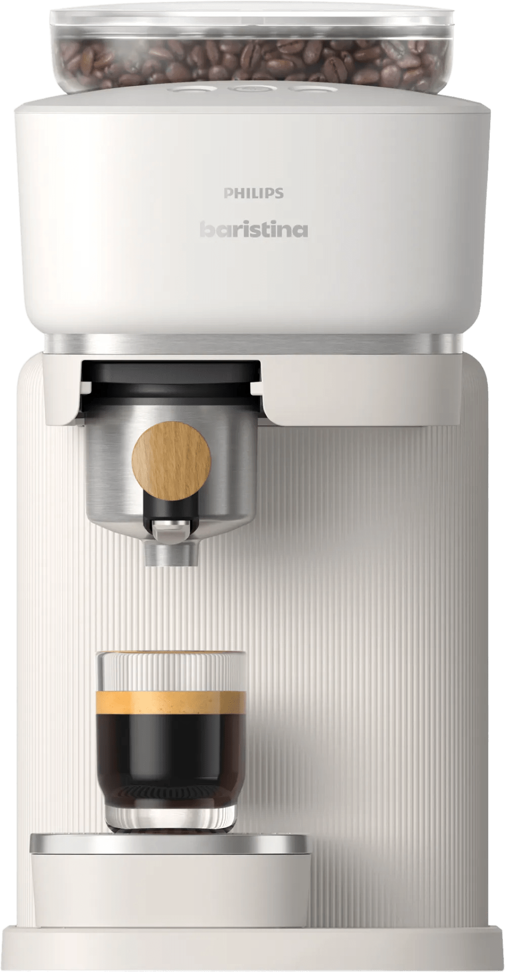 Zet koffie als een echte barista met één druk op de knop met de Philips Baristina BAR302/20 Wit Hout. Doe je favoriete bonen in de machine, kies je koffie en de machine doet zijn werk. De bonen worden met de juiste druk gemalen, zodat jouw koffie hetzelfde smaakt als bij je favoriete koffietentje om de hoek. De gemalen koffie valt in de automatische tamper. Wanneer je koffie klaar is, haal je de tamper uit de machine en klop je `m leeg in de vuilnisbak. Zo ben je weinig tijd kwijt aan het schoonmaken van de machine. Dankzij het smalle formaat past de machine in iedere keuken. Door het strakke ontwerp is de Baristina een toevoeging op ieder aanrecht.