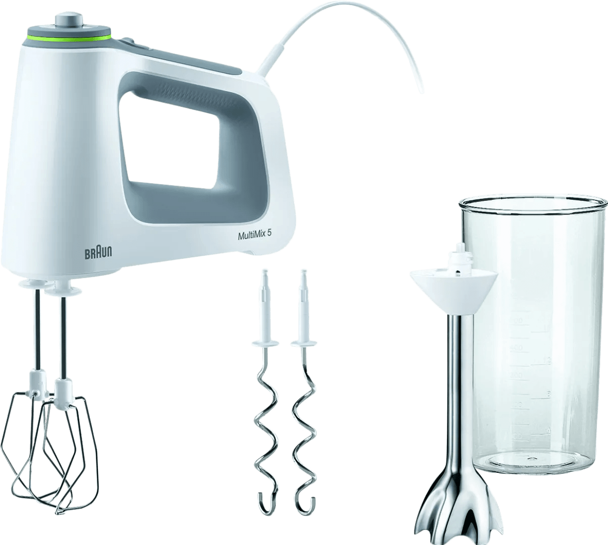 Je gebruikt de Braun MultiMix 5 HM5107WH Wit om mee te kloppen, kneden en pureren. Hierdoor is deze handmixer geschikt om bijvoorbeeld om een eitje los te kloppen, deeg te kneden of een soep te pureren. Het wattage is met 750 watt hoog en je hebt keuze uit 9 standen en een turbofunctie. Zo gebruik je de handmixer ook voor het zwaardere kneedwerk. De accessoires verwissel je gemakkelijk met 1 druk op de knop. Dus heb je eerst de eiwitten opgeklopt, ga je daarna direct door met het kneden van het zanddeeg. Voor je het door hebt staat er een citroenmeringue taart op tafel. Wanneer je klaar bent gaan de losse onderdelen zo de vaatwasmachine in, naar de afwas heb je dus geen omkijken.