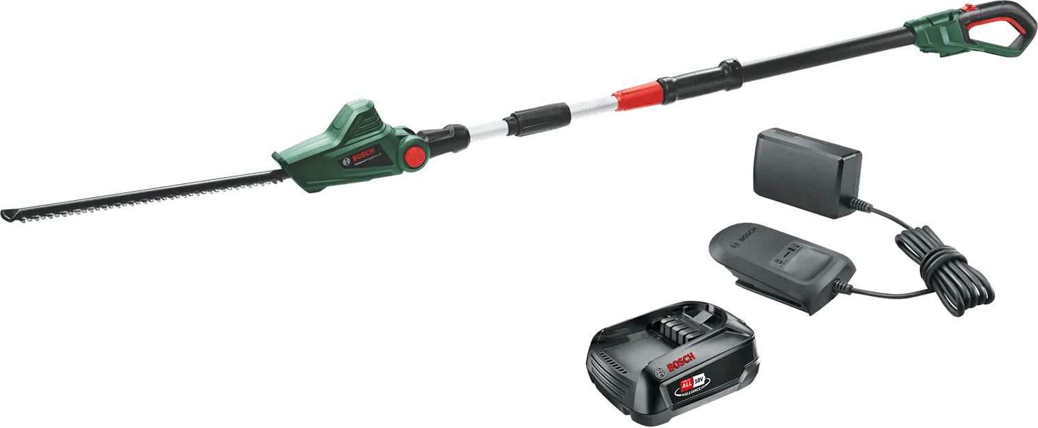 Snoei direct draadloos een hoge heg met de Bosch UniversalHedgePole 18 + POWER FOR ALL 18V 2,5 Ah Accu Set. Je krijgt een telescopische heggenschaar, een 2,5 Ah accu en een acculader. De steel van de heggenschaar schuif je uit tot 2,6 meter. Je hebt daardoor geen ladder nodig. Met het lemmet van 43 centimeter snoei je middelgrote stukken heg in één beweging. Ook snijd je takken tot 16 millimeter dik door. Snoei met de draaibare kop in verschillende hoeken zonder dat je zelf in een moeilijke houding staat. De heggenschaar en accu horen bij het Bosch POWER FOR ALL 18V accu platform. Je gebruikt de accu daardoor ook met ander (tuin)gereedschap van dit platform.