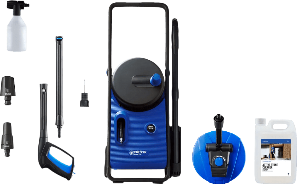 Maak je terras direct schoon met de Nilfisk Core 150 PowerControl Home. In dit pakket zitten een terrasreiniger en een reinigingsmiddel voor steen. Hiermee maak je jouw terras of oprit goed schoon. De hogedrukreiniger heeft een werkdruk van 150 bar. Je pakt daardoor ook andere klussen aan. Spuit bijvoorbeeld je schutting of tuingereedschap schoon. Je kiest zelf de kracht van de waterstraal met de regelbare waterdruk. Zo voorkom je schade. Hardnekkig vuil verwijder je met de meegeleverde vuilfrees. Je verplaatst de hogedrukreiniger gemakkelijk met de wielen. De hogedrukslang is 8 meter lang, zodat je alle hoeken van je tuin bereikt. Na gebruik rol je de slang knikvrij op in de ingebouwde haspel.