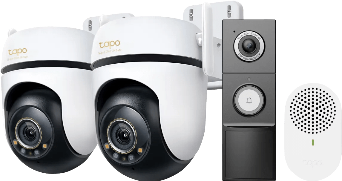 Met de TP-Link Tapo C530WS Duo Pack + D235 Smart Battery & Wired Doorbell beveilig je jouw hele voor- en achtertuin. Door de grote kijkhoek van de deurbel en de pan tilt zoom functie van de camera’s mis je niets.