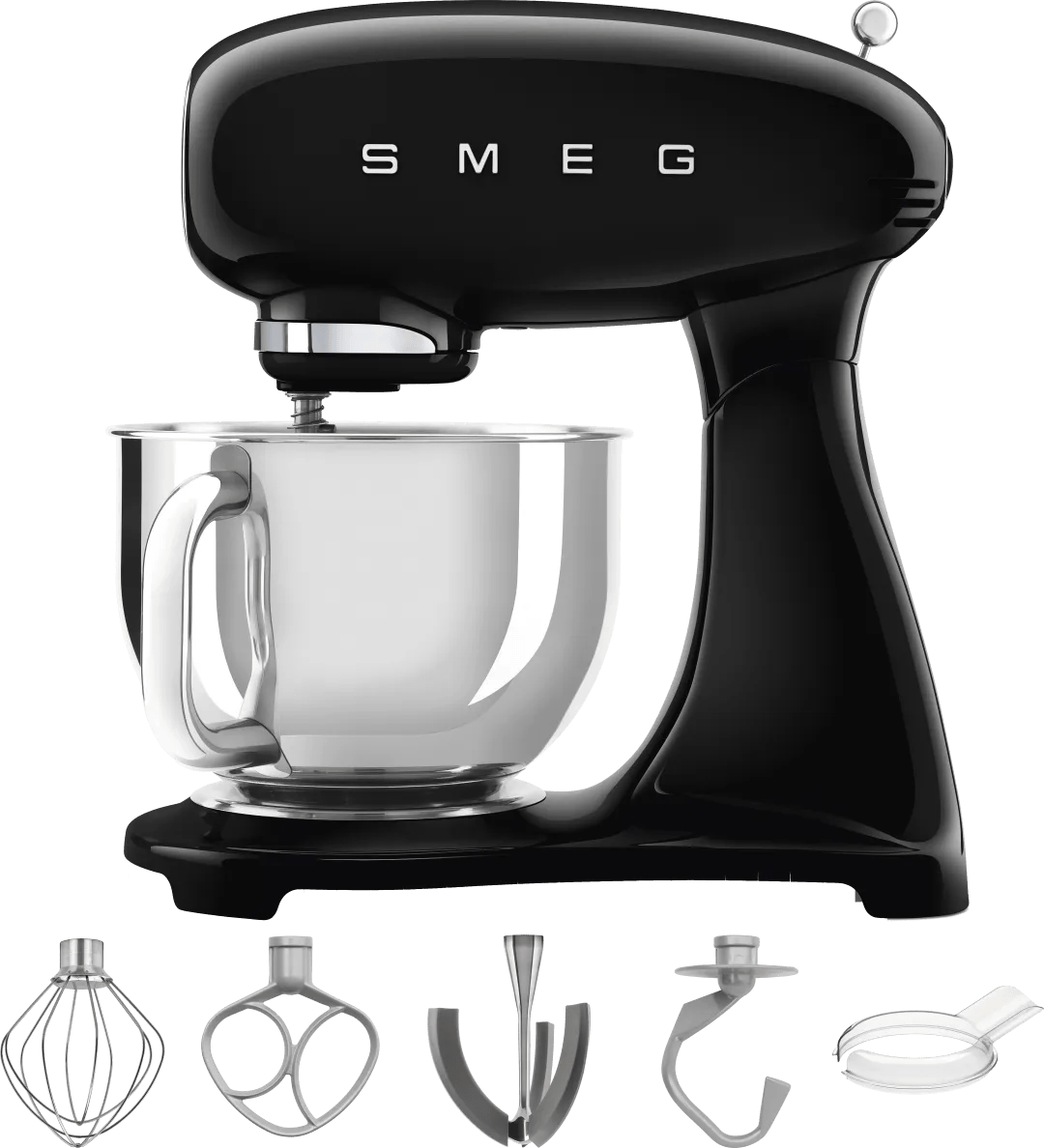 Met de SMEG SMF03BLEU Zwart staat er een vintage keukenmixer op jouw aanrecht waarmee je brooddeeg en taartbeslag maakt. De meegeleverde opzetstukken en 10 ingebouwde standen geven je veel controle en invloed op het eindresultaat. Je gebruikt de lagere standen om de ingrediënten tot een goed beslag te kneden. De hogere standen gebruik je om de slagroom voor op je taart te kloppen. De soft start zorgt ervoor dat de mixer rustig met mengen begint. Handig. Zo slaat de keukenmixer niet het beslag uit de rvs mengkom van 4,8 liter. Ben je klaar met bakken, dan was je flexi-klopper, kneedhaak en mengkom gemakkelijk af in de vaatwasser. De garde en antispatdeksel was je met de hand af.