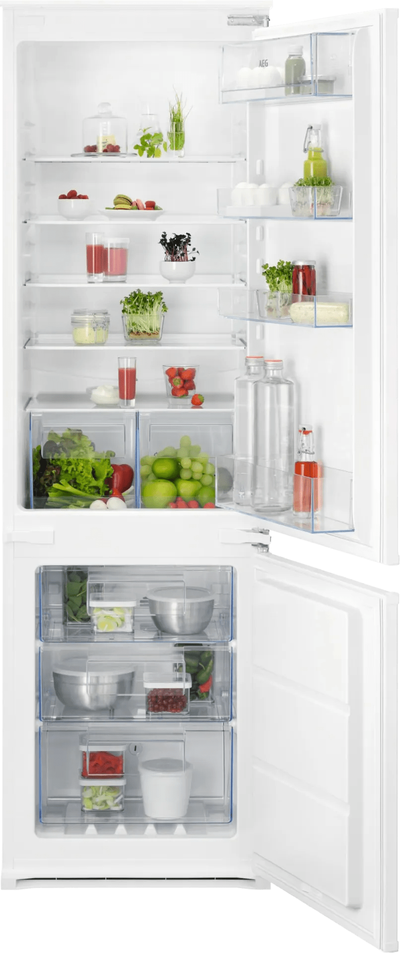 De AEG OSC6N181ES koel-vriescombinatie bewaart de boodschappen van 3 tot 4 personen. Je verdeelt je yoghurt, boter en vleeswaren over de 4 plateaus. Doordat de plateaus uitneembaar zijn, maak je gemakkelijk ruimte voor bijvoorbeeld hoge flessen of een grote pan soep. Onder in het koelgedeelte leg je je broccoli, tomaten en paprika's in de groentelade. Achter de onderste deur zit het vriesgedeelte. Je stapelt hier je bakjes pasta gemakkelijk op elkaar op de 2 plateaus. De vriezer heeft één vrieslade. Hier leg je je brood of favoriete pizza's in. No Frost voorkomt ijsvorming in het apparaat. Hierdoor hoef je de vriezer nooit te ontdooien. Dankzij het lage geluidsniveau van 35 decibel heb je geen last van een zoemend geluid op de achtergrond.