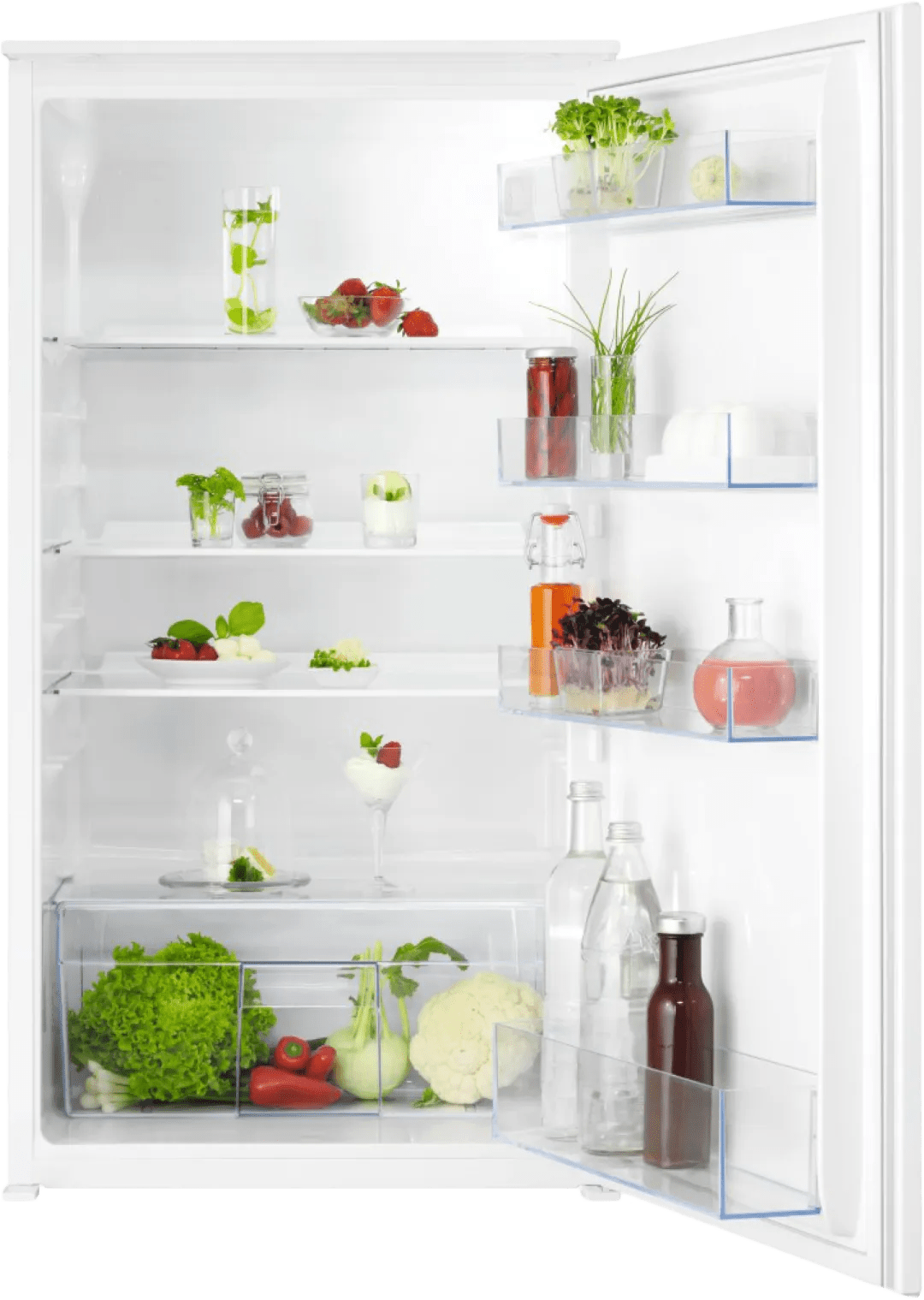 In de AEG OSK5O10ES 1-deurs inbouw koelkast bewaar je de boodschappen voor 3 tot 4 personen. Met een inhoud van 180 liter en 3 uitneembare plateaus leg je gemakkelijk je weekboodschappen in dit model. Op welke hoogte je je augurken, mayonaise of kipfilet legt, maakt niet uit. Dankzij de luchtcirculatie is het namelijk overal in de koelkast even koel. Onder in de koelkast vind je over de volledige breedte de groentelade. Deze is breed genoeg voor een kropsla of je komkommers. Terwijl dit model je boodschappen koel houdt, kijk jij ongestoord een spannende film. Met een geluidsniveau van 35 decibel heb je namelijk geen last van een zoemend geluid op de achtergrond.