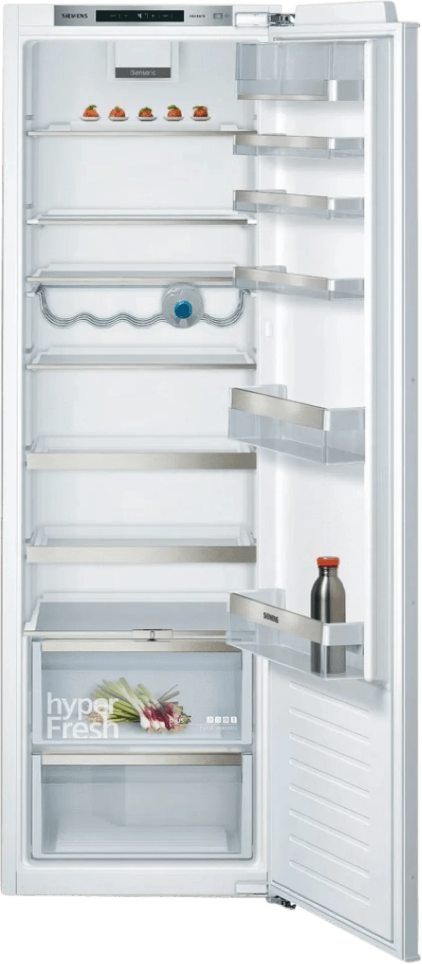 In de Siemens KI81RAFE0 bewaar je je groente en fruit extra lang. Deze inbouw 1-deurs koelkast is namelijk voorzien van een hyperFresh plus lade met instelbare luchtvochtigheid. Zo blijven je aardbeien en paprika's langer vers en knapperig. Met 6 plateaus heb je genoeg ruimte voor een grote voorraad boodchappen en hoef je niet te proppen. Zo berg je je bakje aardbeien makkelijker op en pak je sneller een potje pesto uit de koelkast. Met het meegeleverde flessenrek berg je eenvoudig flessen fris of wijn op. Heb je iets achter in de koelkast staan? Met het easyAccess plateau schuif je het gehele plateau naar je toe, zodat je dit gemakkelijk pakt.