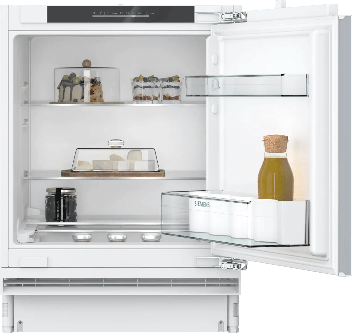 De Siemens KU21RVFE0 is een kleine onderbouw koelkast zonder vriesvak. Je bewaart hier je dagelijkse boodschappen, zoals melk, yoghurt en fruit. Met de verstelbare plateaus kies je zelf een indeling die jij handig vindt en maak je ruimte voor een pan soep. In de deurvakken is genoeg plaats voor kleinere boodschappen, zoals potjes augurken en olijven. Wil je snel een koud blikje cola? Kies dan voor de superkoelen functie. De koelkast verlaagt dan tijdelijk de temperatuur, zodat je boodschappen extra snel koud zijn. Je past gemakkelijk de instellingen van de koelkast aan dankzij de Home Connect app op je smartphone of tablet. Dit doe je ook vanuit de supermarkt.