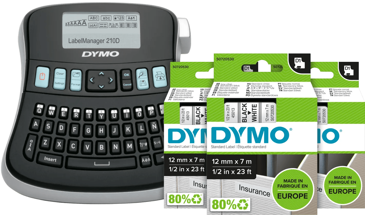 Label, plak en organiseer met de DYMO LabelManager 210D+ Labelprinter Qwerty + 3 extra labels. Je krijgt bij deze labelprinter 3 extra labelcassettes, waardoor je nog meer labels maakt. Deze labelprinter heeft een LCD scherm met toetsenbord. Druk de letter in die je nodig hebt en hij verschijnt op het scherm. Ook kies je verschillende afdrukstijlen zoals lettergrootte en printstijlen. Zo maak je elk label anders. De Labelmanager 210D+ werkt op 6 AA batterijen. Gebruik je de labelmaker even niet? Dan schakelt deze automatisch uit zodat je batterij bespaart.