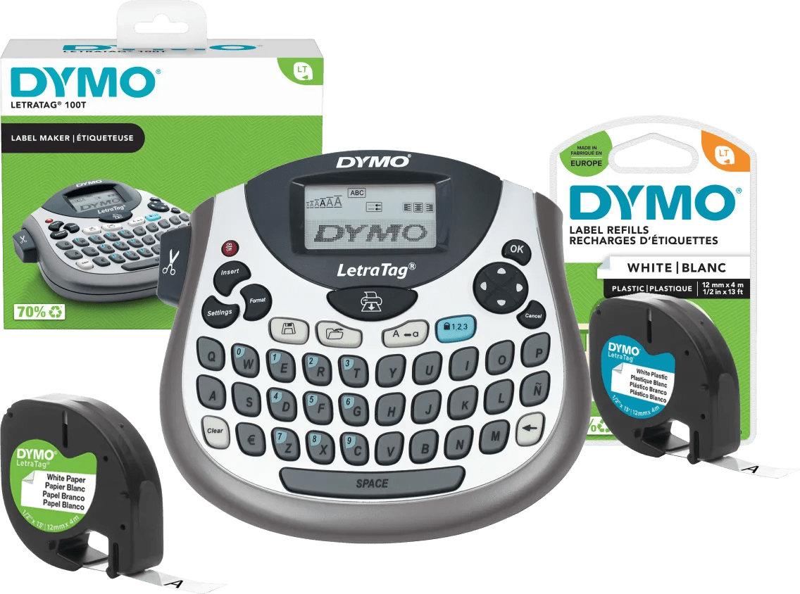Maak professionele labels met één druk op de knop met de DYMO LetraTag LT-100T Labelprinter Qwerty + 1 extra label. Je krijgt bij deze labelprinter een extra labelcassette, waardoor je nog meer labels maakt. Deze compacte labelprinter heeft een LCD scherm met toetsenbord. Druk de letter in die je nodig hebt en hij verschijnt op het scherm. Ook kies je verschillende afdrukstijlen zoals lettergrootte en printstijlen. Zo maak je elk label anders. De LetraTag LT-100T werkt op 4 AA batterijen. Gebruik je de labelmaker even niet? Dan schakelt deze automatisch uit zodat je batterij bespaart.