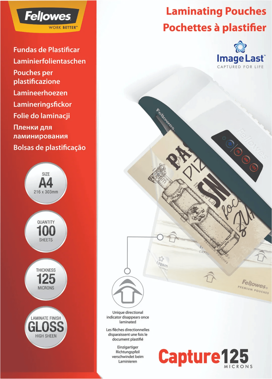 Met de Fellowes Lamineerhoezen Capture 125 mic A4 (100 stuks) ben je voorzien van glanzende lamineerhoezen die bescherming bieden aan al jouw relevante documenten.