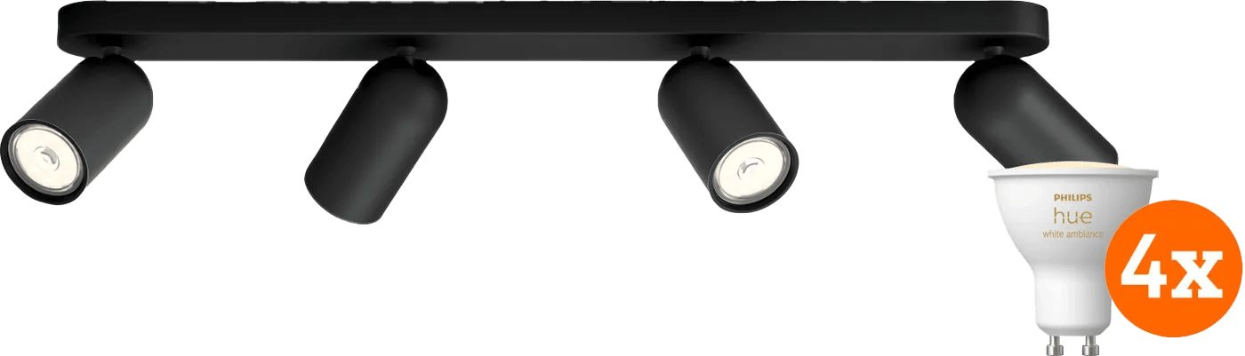 In dit pakket vind je een Philips Hue Pongee opbouwspot - 4 spots - zwart en 4 Philips Hue White Ambiance GU10 smart lampen. Zo voorzie je een Pongee armatuur van een slimme verlichting. Deze White Ambiance lampen geven alle tinten wit licht. Je hangt de Pongee met de meegeleverde bevestigingsmaterialen aan het plafond bij een stroompunt. Hierna draai je gemakkelijk de GU10 spotjes in de fitting. Je bedient de lampen via de Philips Hue app. In de app stel je de lampen naar wens in. Je koppelt de spotjes via bluetooth. Wil je de verlichting ook buitenshuis bedienen, of vaste routines instellen? Dan koop je een Philips Hue Bridge.