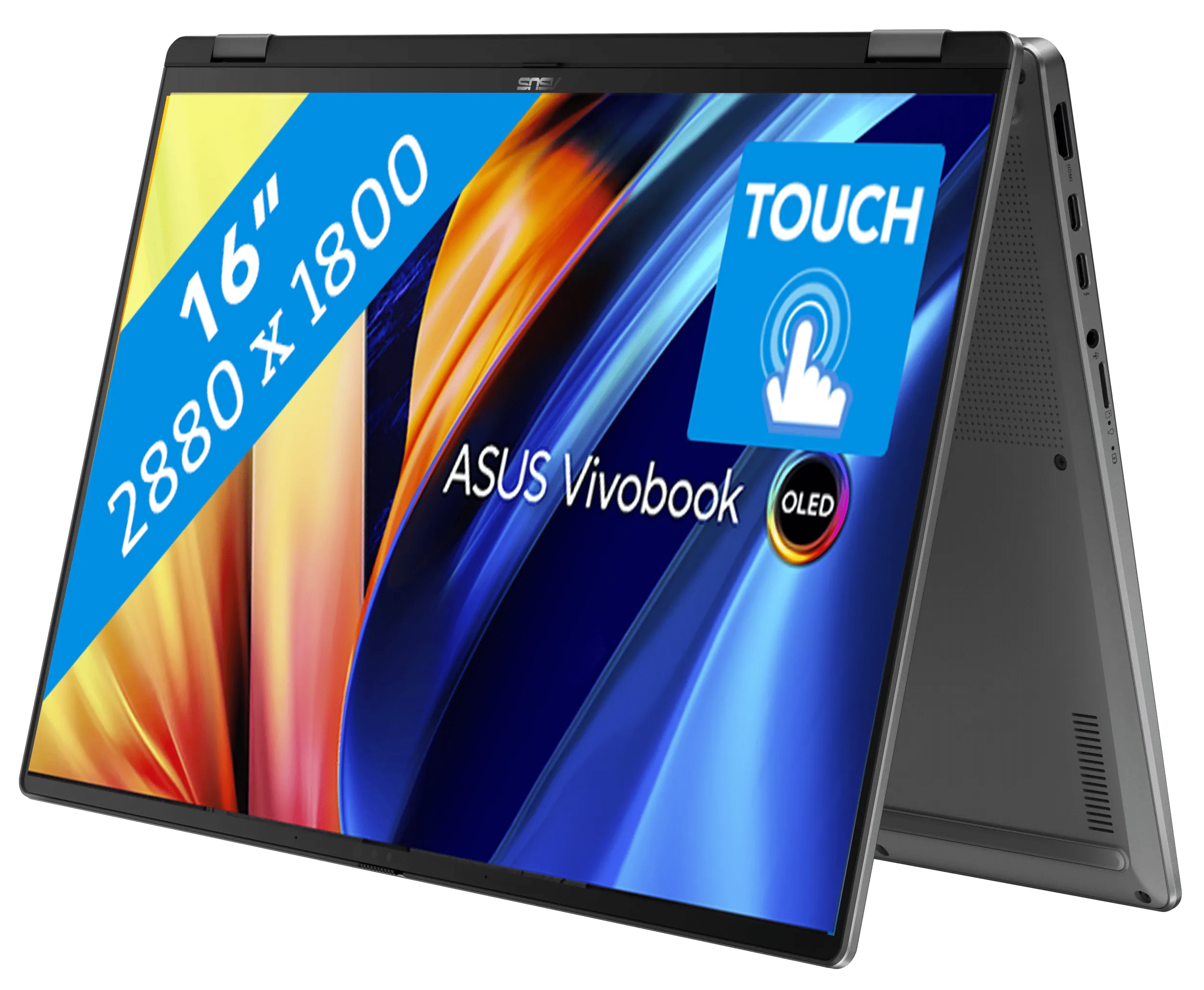 Met de ASUS Vivobook 16 Flip OLED Copilot+ TP3607SH-RJ043W werk je snel met AI en Copilot+ assistent. Je voert lokaal AI taken uit en bewerkt grafische designs met AI. De laptop is een 2-in-1 model met touchscreen. Je klapt het scherm 360 graden om en maakt direct aantekeningen. Het OLED scherm geeft realistische kleuren en beter contrast, waardoor je meer details ziet. De combinatie van een Intel Core Ultra 7 processor en 32 GB werkgeheugen zorgt voor soepele prestaties bij zware taken. Je werkt hierdoor in zware programma's, bewerkt video's en opent meerdere programma's tegelijk zonder vertraging. De speciale NPU chip verwerkt AI taken soepeler en verlengt de batterijduur.