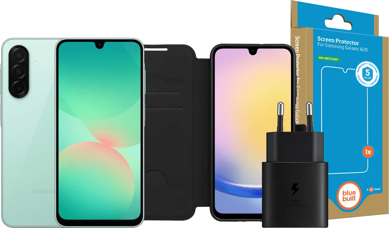 Laad je Samsung Galaxy A26 128GB Groen 5G snel op met de meegeleverde Samsung Oplader 25 Watt Zwart. Binnen 30 minuten zit de batterij voor ongeveer 60 procent vol. Met de BlueBuilt Screenprotector Glas en de BlueBuilt Book Case Zwart bescherm je jouw smartphone tegen krassen en barsten. De Samsung A26 een instapmodel smartphone met een scherp beeldscherm. Op het 6,7 inch full hd scherm van de Samsung A26 kijk je in hoge kwaliteit naar films op Netflix of video's op YouTube. De Samsung A26 heeft een grote 5.000 mAh batterij. Bij gemiddeld gebruik doe je een hele dag met een volle batterij. De Samsung A26 is geschikt voor gemiddelde taken. Je speelt bijvoorbeeld lichte spellen, luistert naar muziek of gebruikt social media apps. Met de camera's op de achterkant van de Samsung A26 maak je redelijk scherpe foto's. Je bewaart je foto's, apps en andere bestanden op het 128 GB opslaggeheugen.