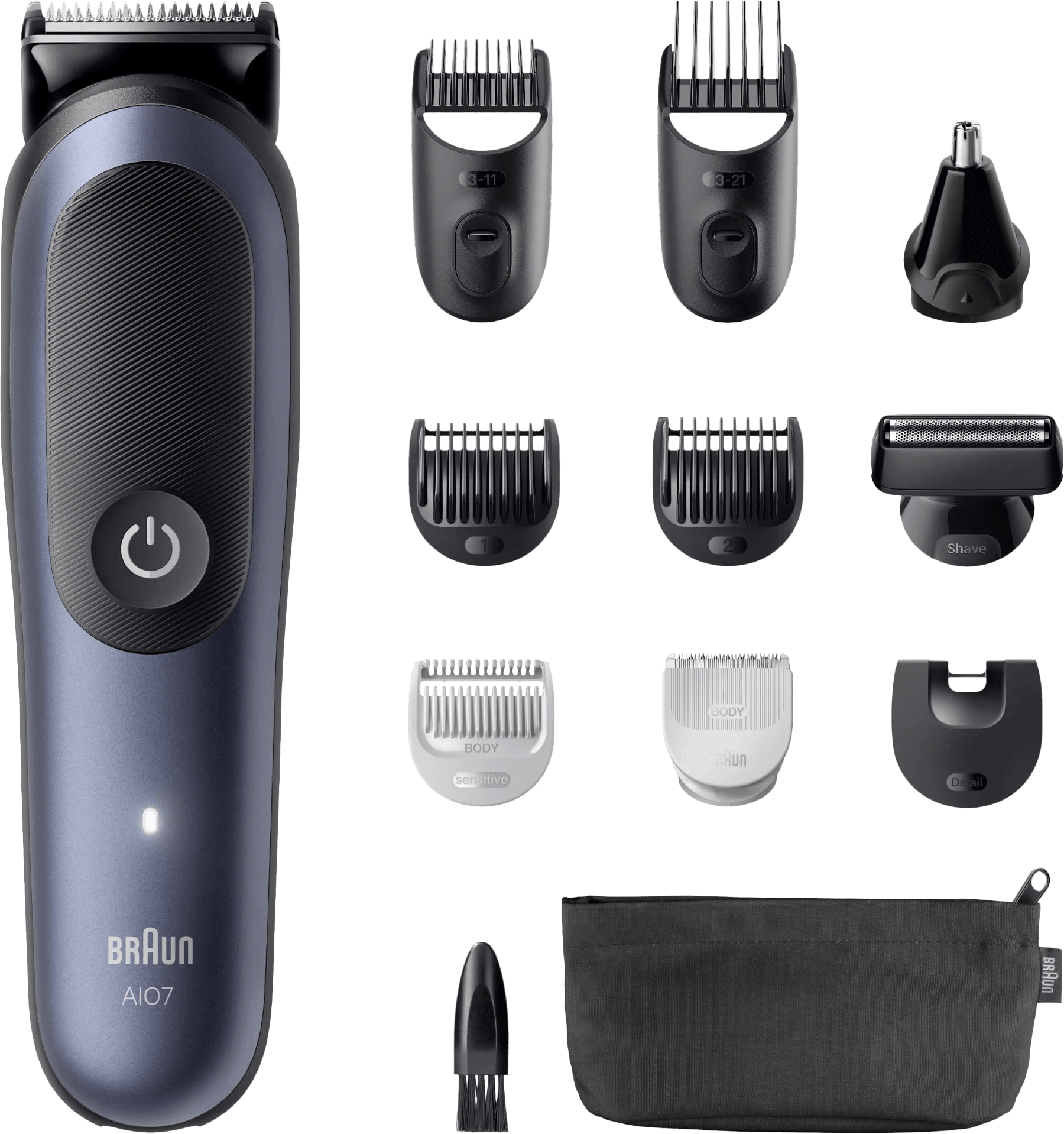 Met de Braun Series 7 AIO7540 verzorg je gemakkelijk je complete baard, hoofd- lichaams- en neushaar. Je krijgt er een neustrimmer opzetstuk bij waarmee je ongewenste neusharen verwijdert. Wil je jouw haar helemaal glad scheren? Dan gebruik je het scheeropzetstuk. Er zit ook een trimkop met SkinGuard technologie voor je lichaam bij. Hiermee verklein je de kans op wondjes. Doordat de multigroom waterdicht is en een handvat met extra grip heeft, trim je comfortabel onder de douche. Dankzij de meegeleverde opzetkammen trim je jouw haar gemakkelijk in de gewenste lengte tussen de 1 en 21 millimeter. Er zitten 2 verstelbare en 2 vaste opzetkammen bij. Wil je bijvoorbeeld je schaamstreek trimmen? Dan gebruik je de kam voor gevoelige zones. Op een volle accu trim 120 minuten.