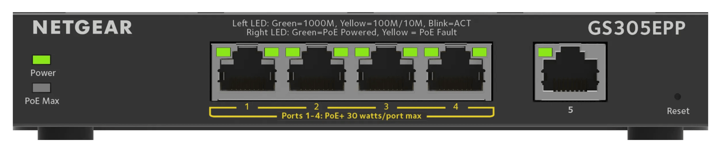 De Netgear GS305EPP is een netwerkswitch met 5 aansluitingen, waarvan er 4 voorzien zijn van Power over Ethernet+. Zo voorzie je apparatuur als ip-camera’s en access points via de netwerkkabel van stroom en heb je geen extra stopcontact nodig. Ook is deze switch volledig in te stellen naar je eigen wensen. Zo geef je met Quality of Service voorrang aan bijvoorbeeld streaming. Zo stottert je favoriete serie niet als je tegelijkertijd ook aan het downloaden bent. Daarnaast houd je precies in de gaten waar het internetverkeer op je netwerk heen gaat. Mocht het internet langzaam zijn, dan zie je met deze switch eenvoudig wie er veel bandbreedte gebruikt. Dankzij VLAN deel je jouw netwerk op in verschillende delen. Zet bijvoorbeeld een eigen netwerk aan voor je thuiskantoor. Je kinderen of vrienden die over de vloer komen, kunnen zo niet bij je zakelijke bestanden.
