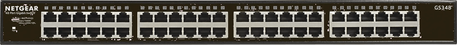 Maak van 1 bedrade verbinding 47 verbindingen met de Netgear GS348. Deze switch heeft 48 poorten, waarbij je er één gebruikt voor de verbinding tussen je router en de switch. De GS348 is geschikt voor installatie in je serverkast. Hij past namelijk precies in een rackmount. Omdat je de switch niet instelt, koppel je hem aan je netwerk en gebruik je hem het volgende moment.