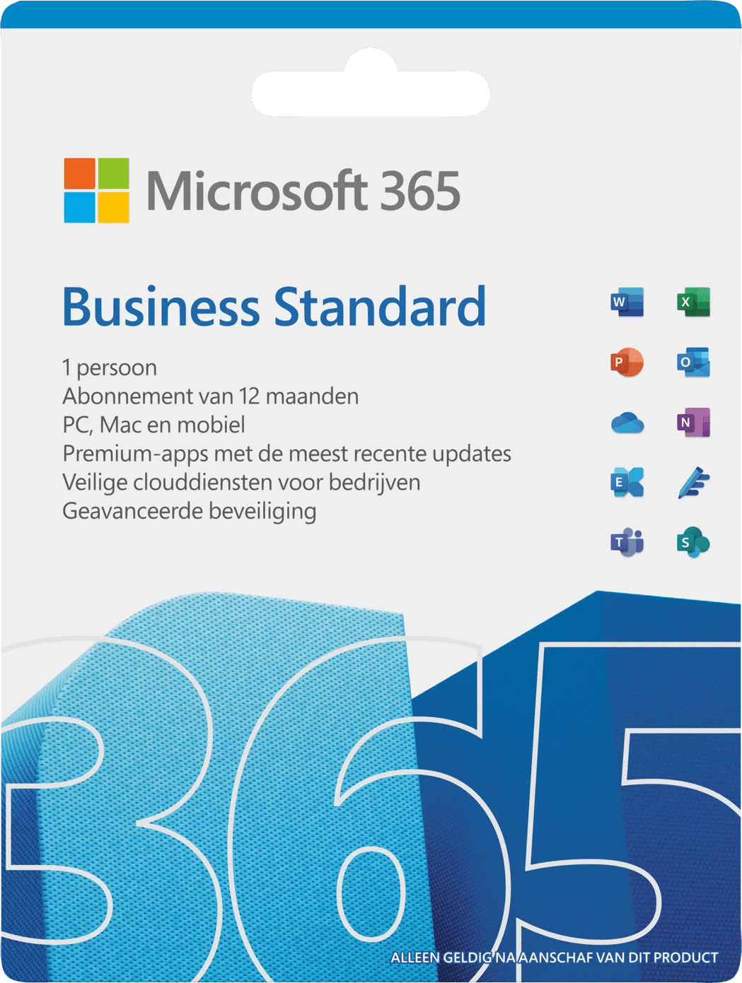 Met Microsoft 365 Business Standard 1 jaar Abonnement heb je alles wat je van Microsoft gewend bent, met functionaliteiten voor zakelijk gebruik. De nieuwste versies van Office software zoals Word voor tekstverwerking, Excel voor data analyses, Powerpoint voor presentaties, OneNote voor notities, Outlook voor mail, Access en Publisher, zorgen ervoor dat je weer helemaal bij de tijd bent. Maar deze licentie geeft ook toegang tot Outlook Consumer Manger om je overstromende mailbox beter te managen. Daarnaast helpt de applicatie Microsoft Bookings jou om de relatie met je klanten te onderhouden. Zo reserveren jouw klanten gemakkelijk tijd in je agenda of boeken ze jouw service. Deze licentie is geschikt voor één gebruiker met een zakelijk account en je installeert de service op al jouw pc's, Macs, smartphones, iPhones en tablets. Let op: dit software pakket mag alleen worden teruggestuurd als de verpakking verzegeld en ongeopend is.