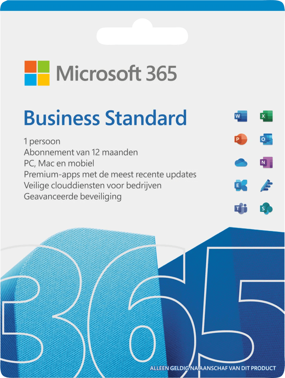 Met Microsoft Office 365 Business Standard 1 jaar Abonnement heb je alles wat je van Microsoft gewend bent, met functionaliteiten voor zakelijk gebruik. De nieuwste versies van Office software zoals Word voor tekstverwerking, Excel voor data analyses, Powerpoint voor presentaties, OneNote voor notities, Outlook voor mail, Access en Publisher, zorgen ervoor dat je weer helemaal bij de tijd bent. Maar deze licentie geeft ook toegang tot Outlook Consumer Manger om je overstromende mailbox beter te managen. Daarnaast helpt de applicatie Microsoft Bookings jou om de relatie met je klanten te onderhouden. Zo reserveren jouw klanten gemakkelijk tijd in je agenda of boeken ze jouw service. Deze licentie is geschikt voor één gebruiker met een zakelijk account en je installeert de service op al jouw pc's, Macs, smartphones, iPhones en tablets. Let op: dit software pakket mag alleen worden teruggestuurd als de verpakking verzegeld en ongeopend is.