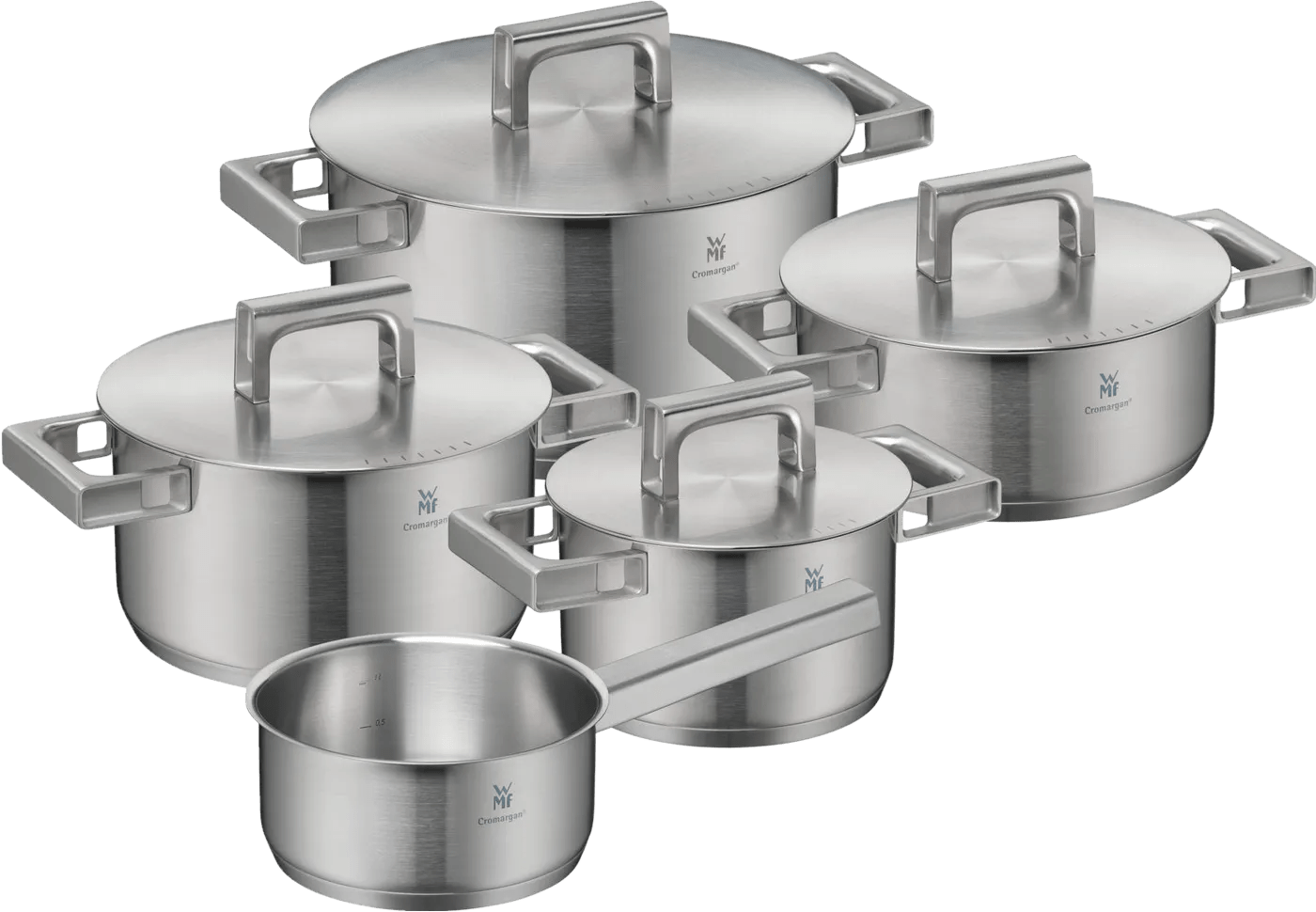 Je gebruikt geen ovenhandschoenen of pannenlappen met de WMF Ultimate Cool pannenset 5-delig. De Cool+ handgrepen blijven altijd onder de 42 graden Celsius, zelfs wanneer de pan langer op het vuur staat. In de set zitten 4 kookpannen en één steelpan. Hierdoor maak je veel verschillende bereidingen. Je gebruikt ook geen maatbeker dankzij de handige literaanduiding in de pannen. Hierdoor meet je vloeistoffen direct af. Dat is handig wanneer je een recept volgt. De pannnenset is geschikt voor alle warmtebronnen, inclusief inductie en de oven tot 250 graden Celsius. Je bereidt bijvoorbeeld je favoriete stoofgerecht op het gasfornuis en laat het verder garen in de oven.