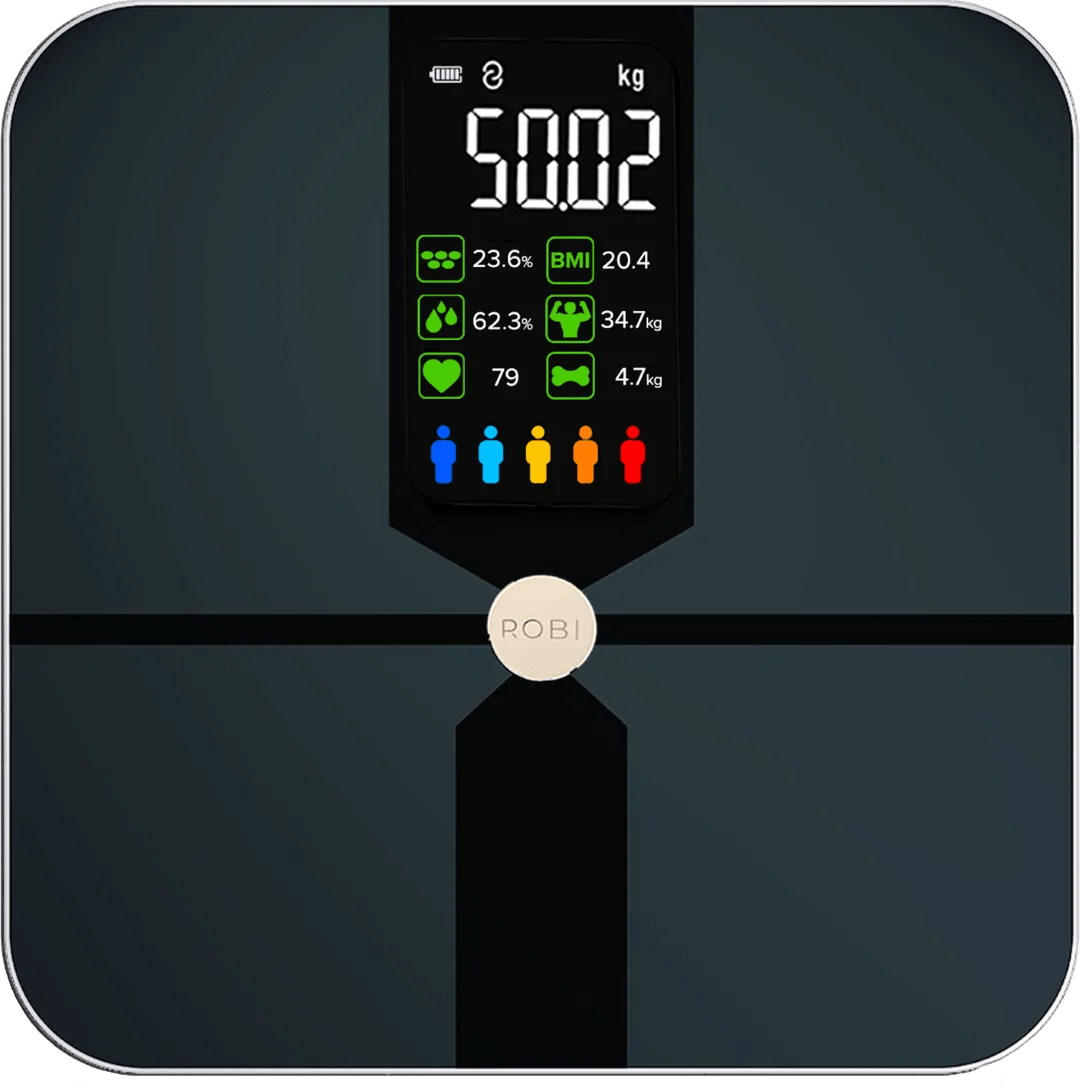 Met de Robi S9 krijg je meer inzicht in je lichaamssamenstelling en je hartslag. Deze weegschaal meet naast je hartslag bijvoorbeeld ook je vetpercentage, botmassa en vochtgehalte. Zo krijg je een goed beeld van je lichaam. Hij geeft ook je metabolische leeftijd aan. Dit geeft aan hoe gezond je lichaam is. Je verbindt de weegschaal met de smartphone app. In de app houd je alle metingen gemakkelijk bij. Zo zie je bijvoorbeeld het verloop van je gewicht. De app geeft advies over welke waardes geschikt zijn voor jouw situatie. Hierdoor behaal je gemakkelijker je doelen. Je houdt de voortgang van meerdere personen bij dankzij de 24 gebruikersprofielen. Door het grote display lees je alle informatie gemakkelijk af.