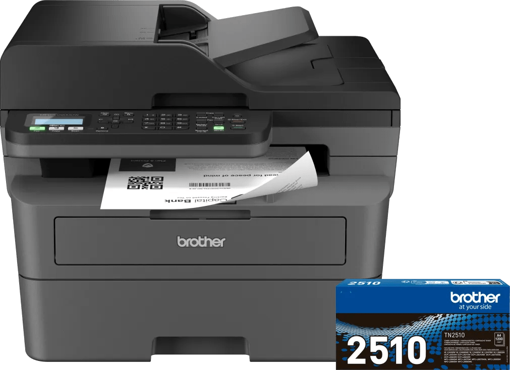 Haal genoeg inkt in huis voor al je zwart-wit documenten met de Brother MFC-L2800DW + 1 extra zwarte toner bundel. De Brother MFC-L2800DW is een snelle all-in-one zwart-wit laserprinter voor kantoor. Wil je printen, scannen of een kopie maken? Met dit model doe je het allemaal. Je kopieert een stapel papier automatisch met de automatische documentinvoer. Dat bespaart veel tijd en handmatig werk. Printen doe je met een snelheid van 32 pagina's per minuut. Je drukt ook automatisch dubbelzijdig af, waardoor je een stuk minder papier gebruikt. Verbind de printer gemakkelijk draadloos met je smartphone via de Brother Mobile Connect app. Of print via een usb stick of kabel. Geschikt voor Brother EcoPro Deze printer is geschikt voor Brother EcoPro, het voordelige printabonnement van Brother. Je ontvangt automatisch cartridges wanneer je huidige cartridges leeg zijn. Lege cartridges stuur je gratis terug. Daarnaast krijg je een doorlopende garantie voor jouw printer. Probeer Brother EcoPro gratis voor een proefperiode van 6 maanden. Meer informatie over EcoPro? Bekijk ons adviesartikel.